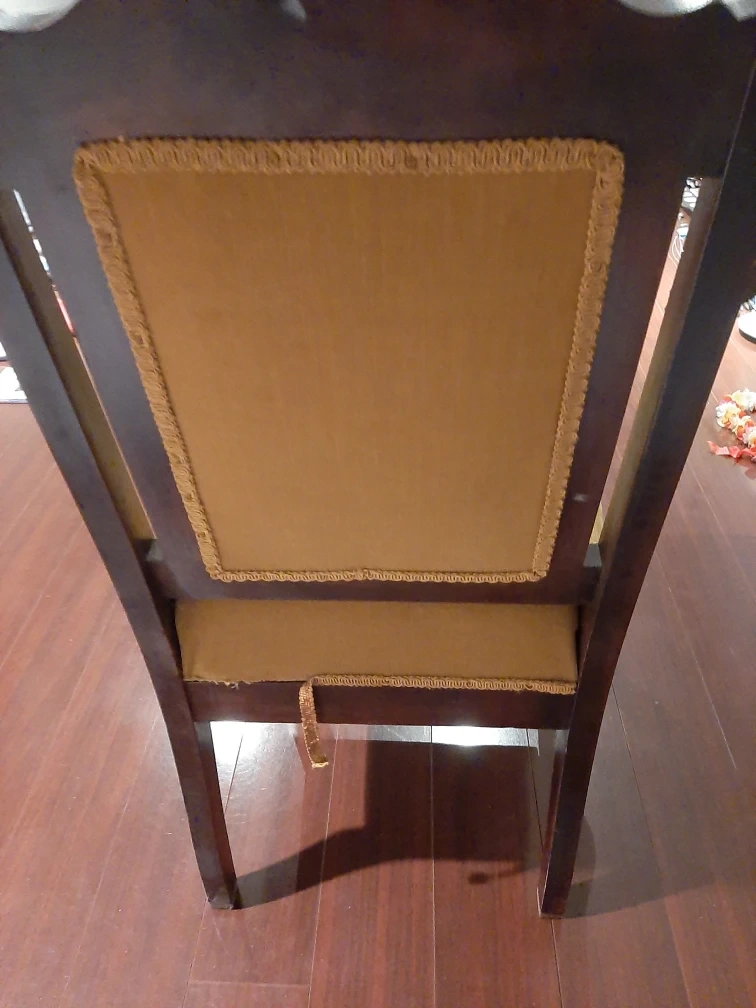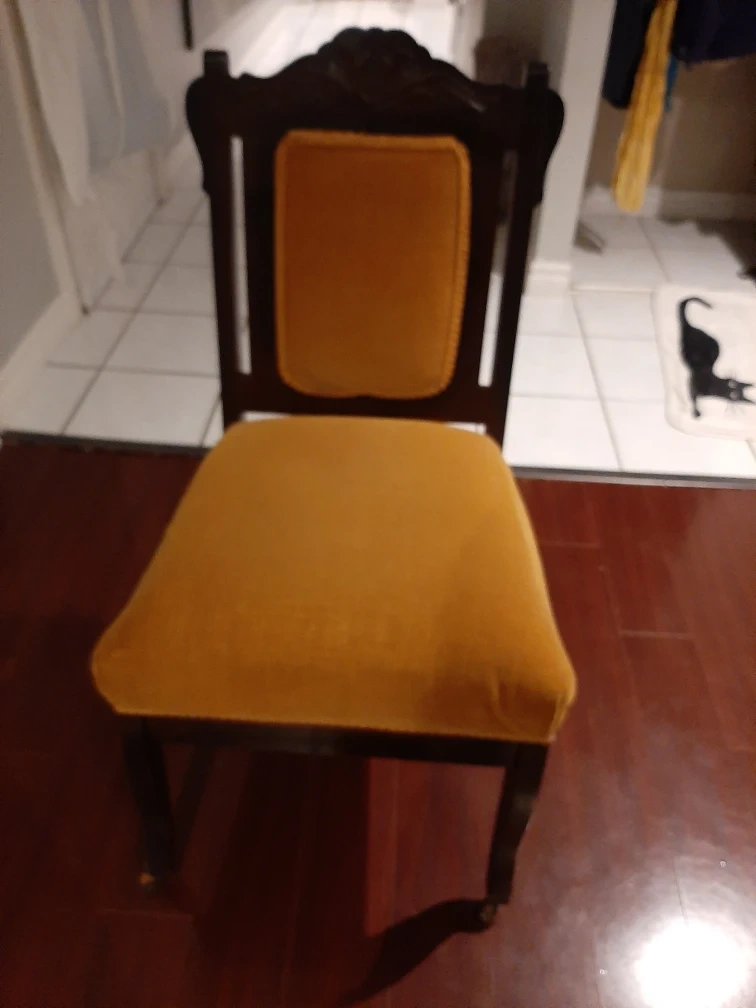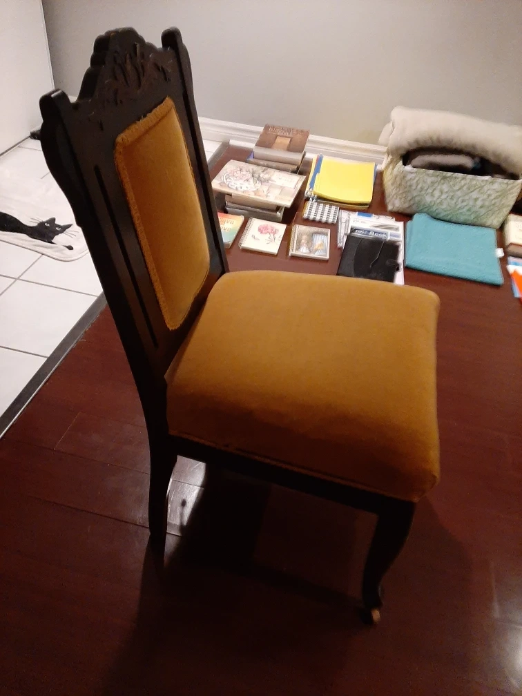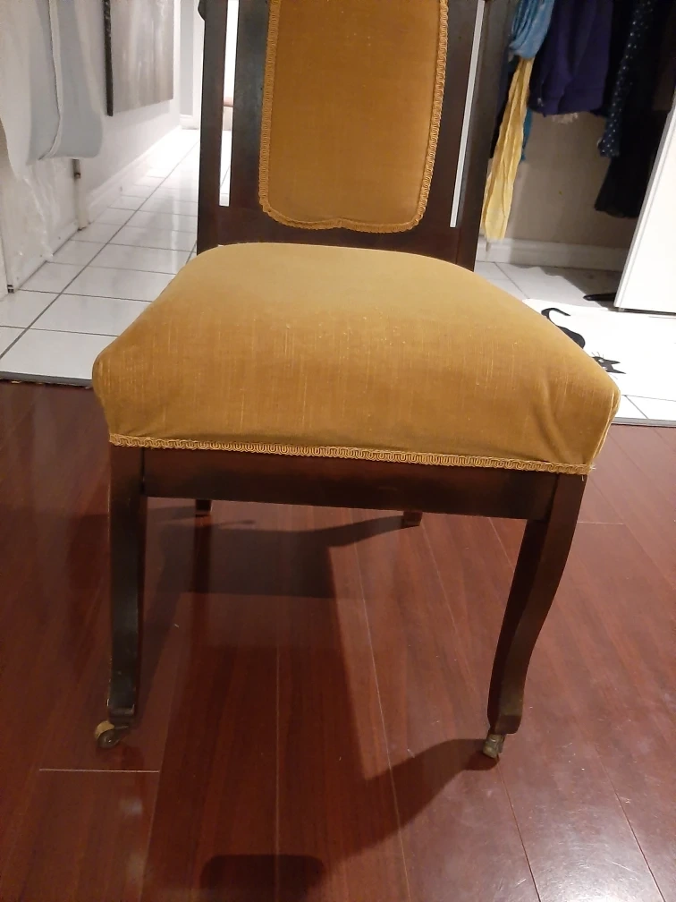 Antique chair. Dark wood frame. Mustard yellow velvet seat and back. Ornate detailing on the back. Trim loose in parts but can easily be glued back on. Pick up Scarborough.