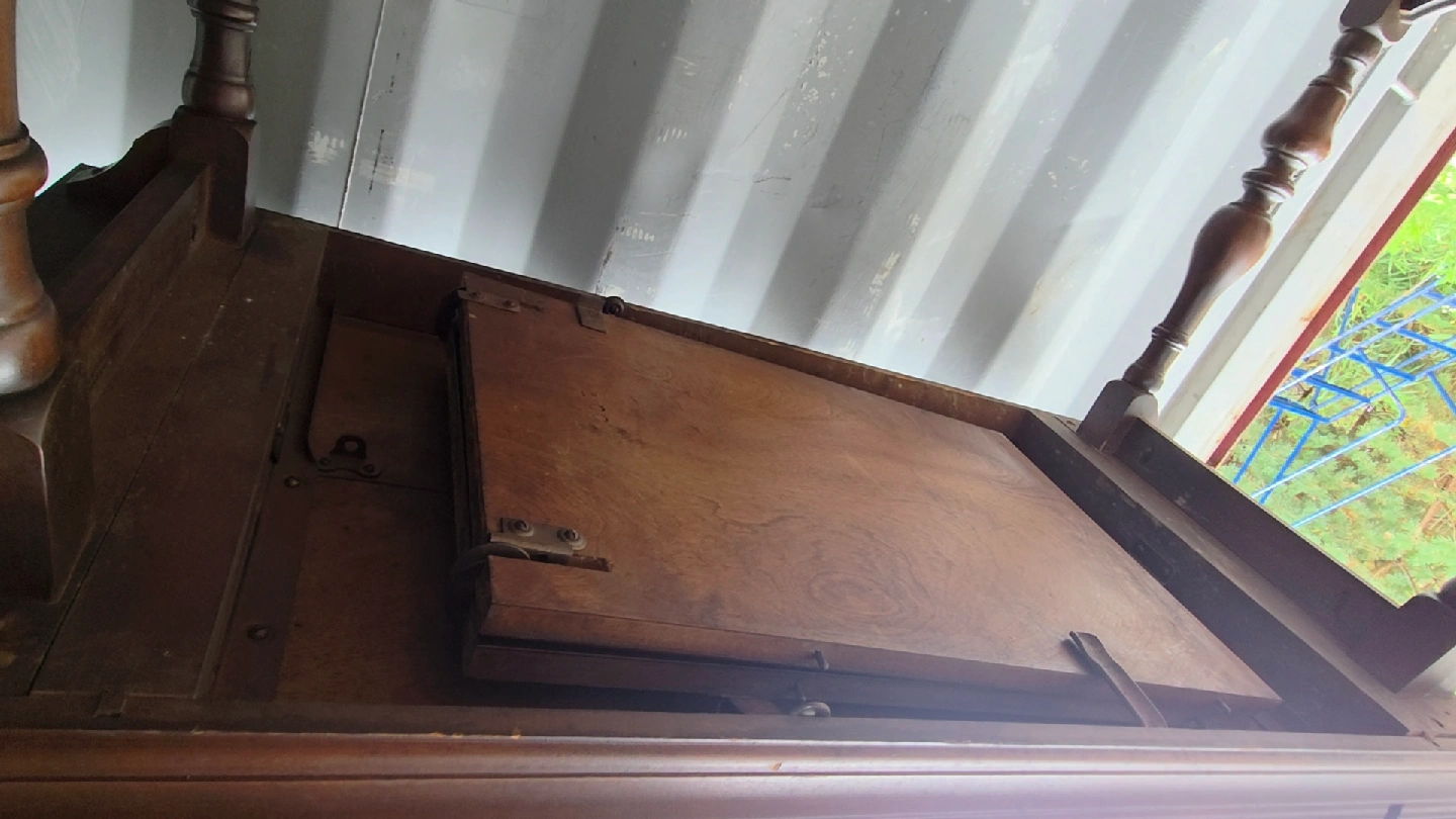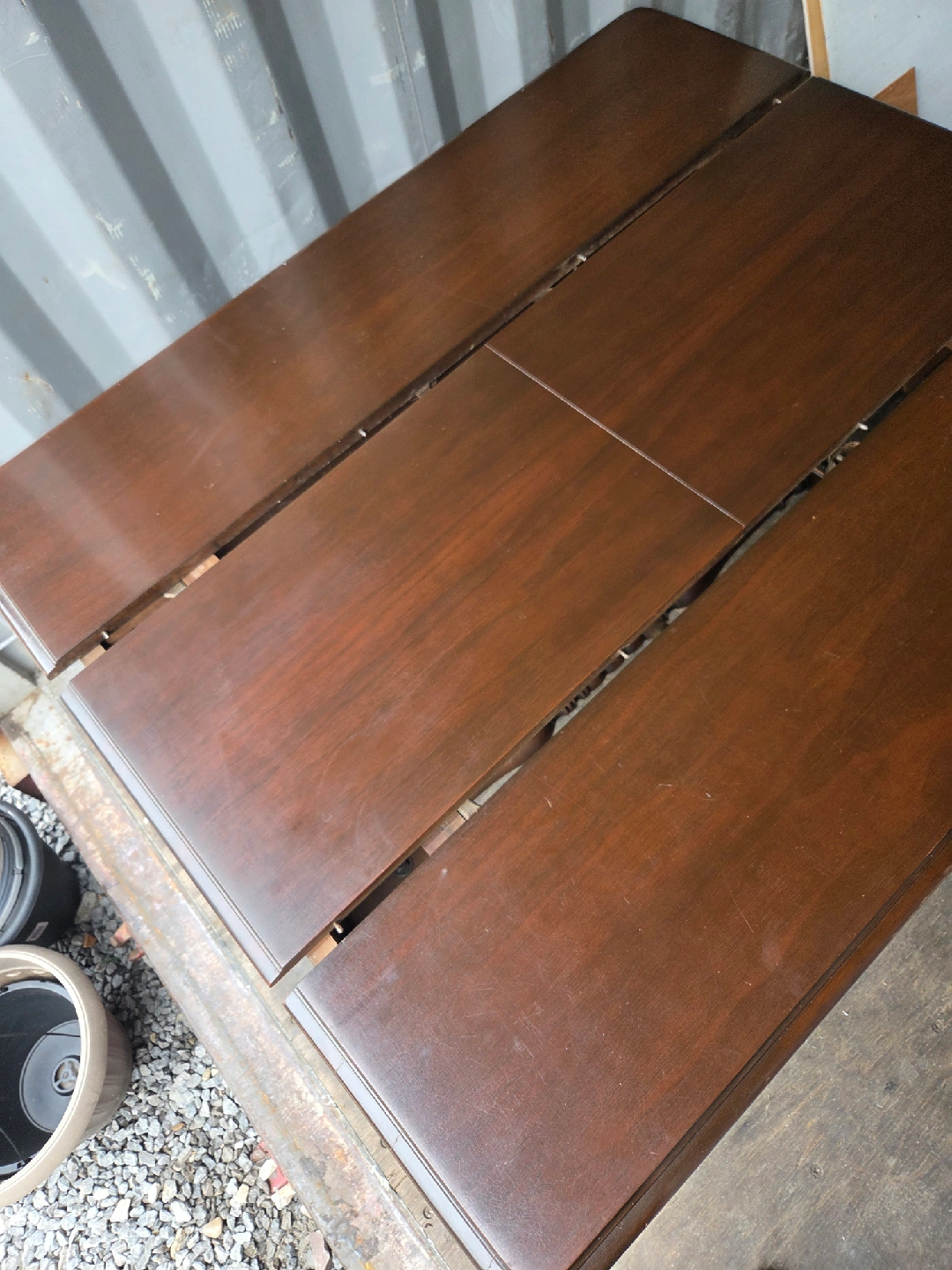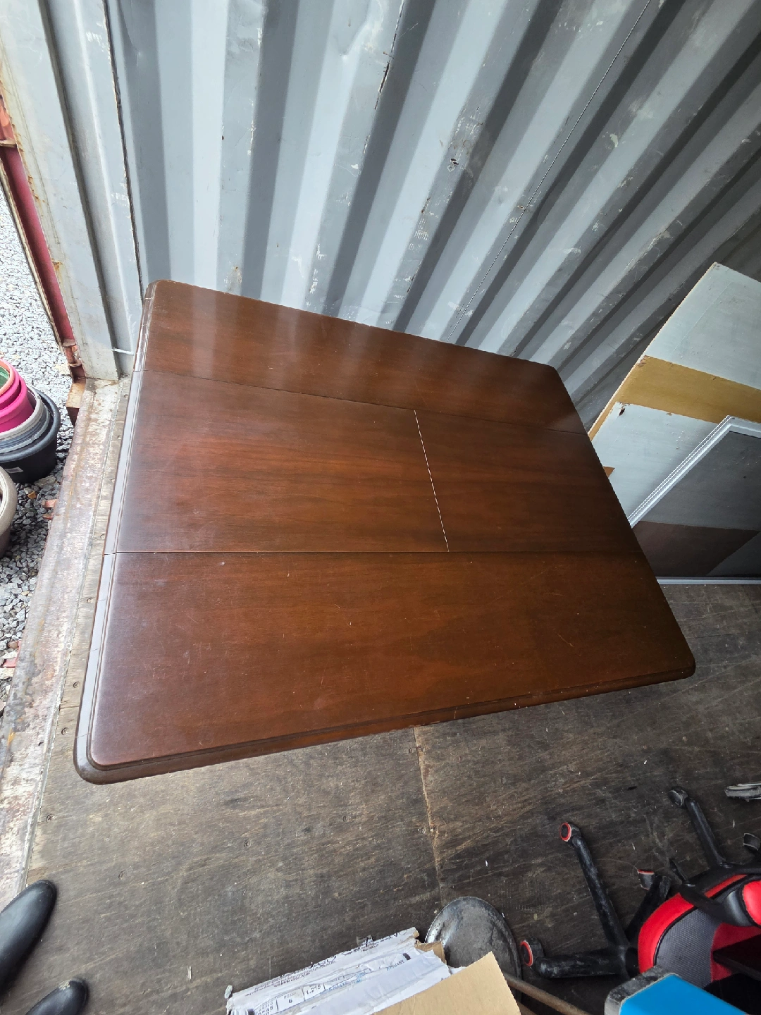 Here's a lovely antique wooden dining table with an extendable leaf! It has a beautiful dark wood finish and ornate legs. Perfect for adding a touch of vintage charm to your dining room or kitchen Cash only