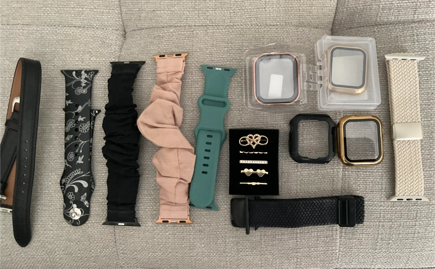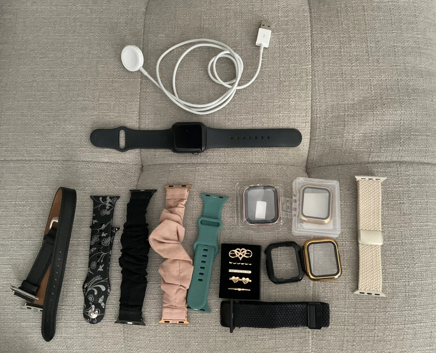 Selling an Apple Watch 6 (42) with a variety of bands and accessories! Included are multiple watch bands in different styles and colours, screen protectors, and decorative rings. Also includes the charger