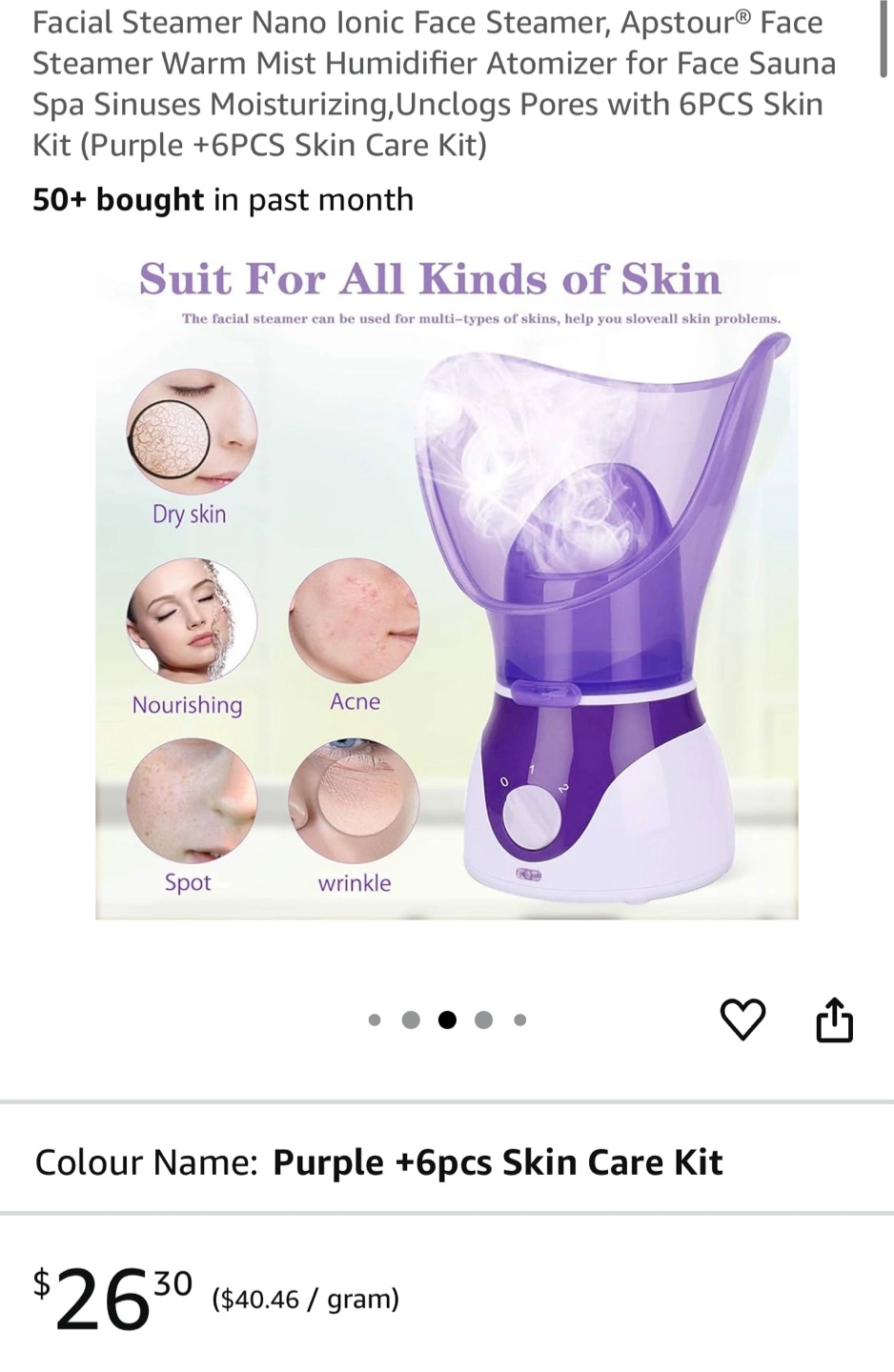 I'm selling an Apstour facial steamer It's a nano ionic face steamer and warm mist humidifier atomizer, perfect for face sauna spa sinuses moisturizing and unclogging pores Colour Name: Purple +6pcs Skin Care Kit
