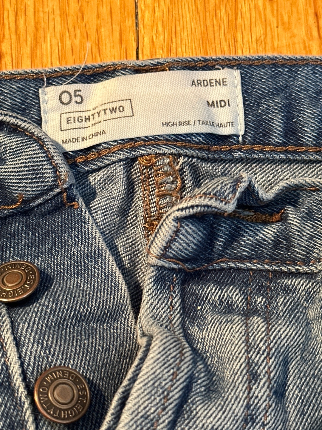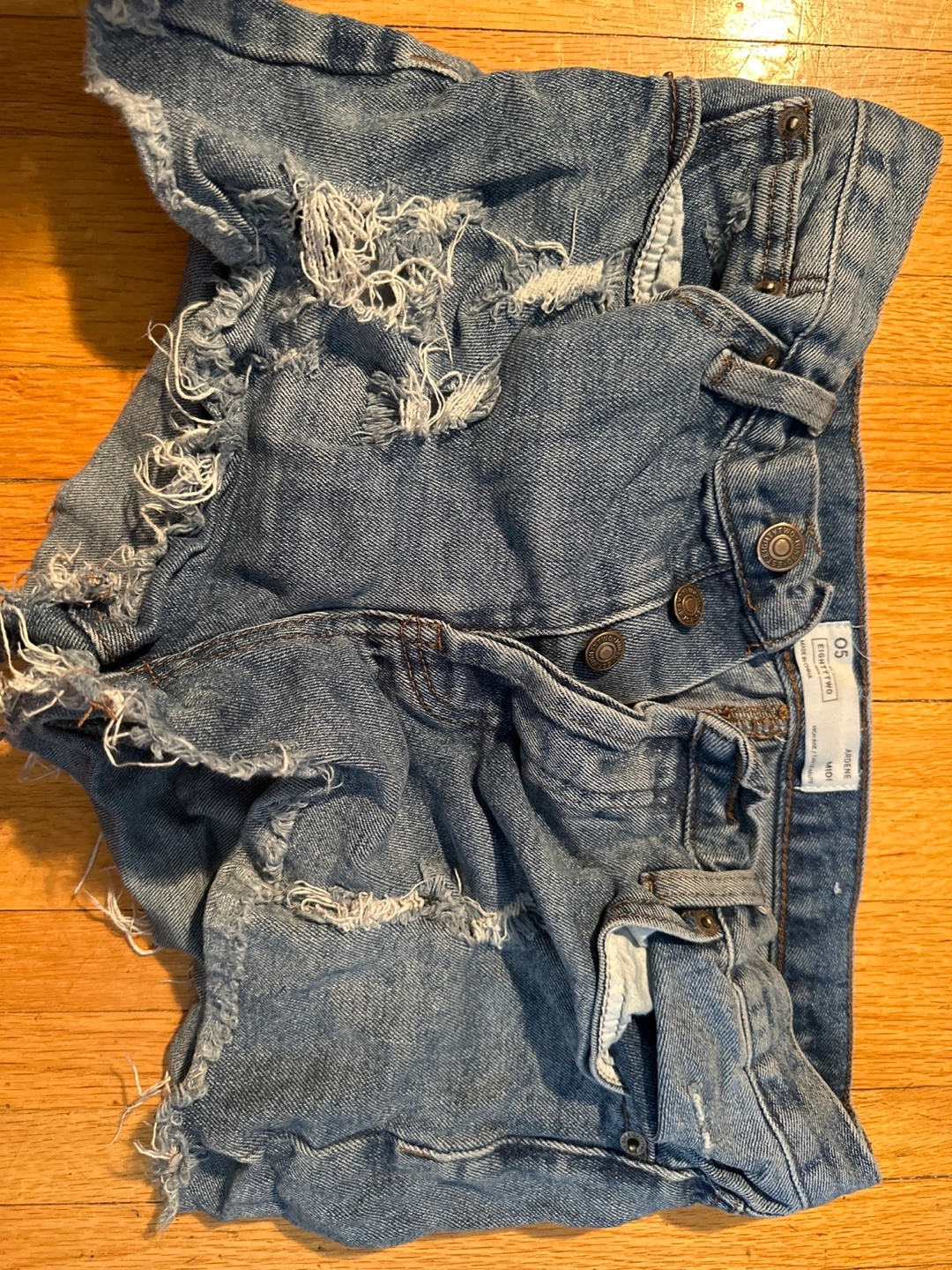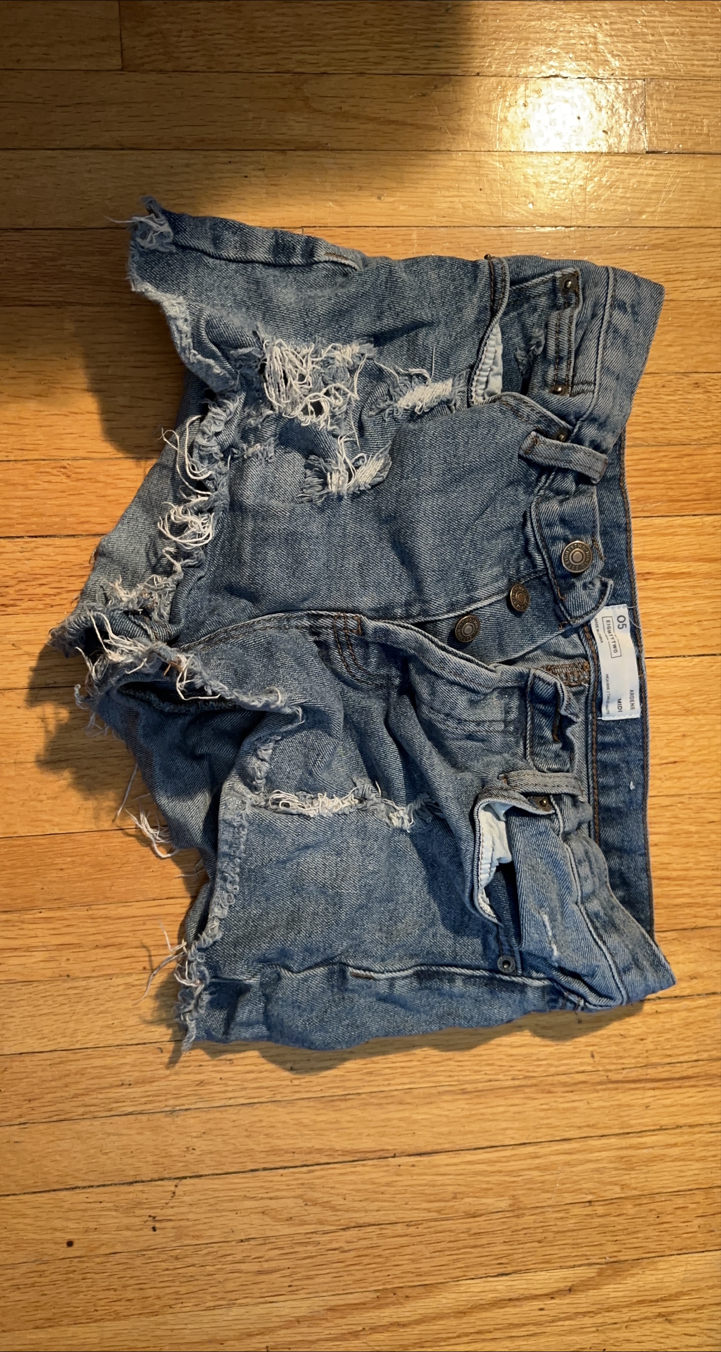 These are Ardene denim shorts in a size 05. They feature a high rise and midi length. The shorts have a distressed, ripped look. They are in used condition.