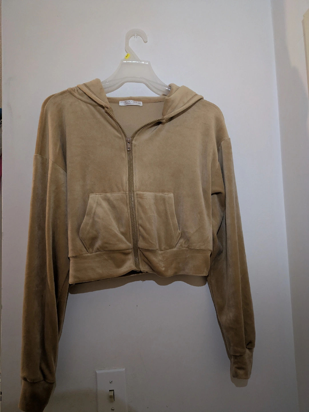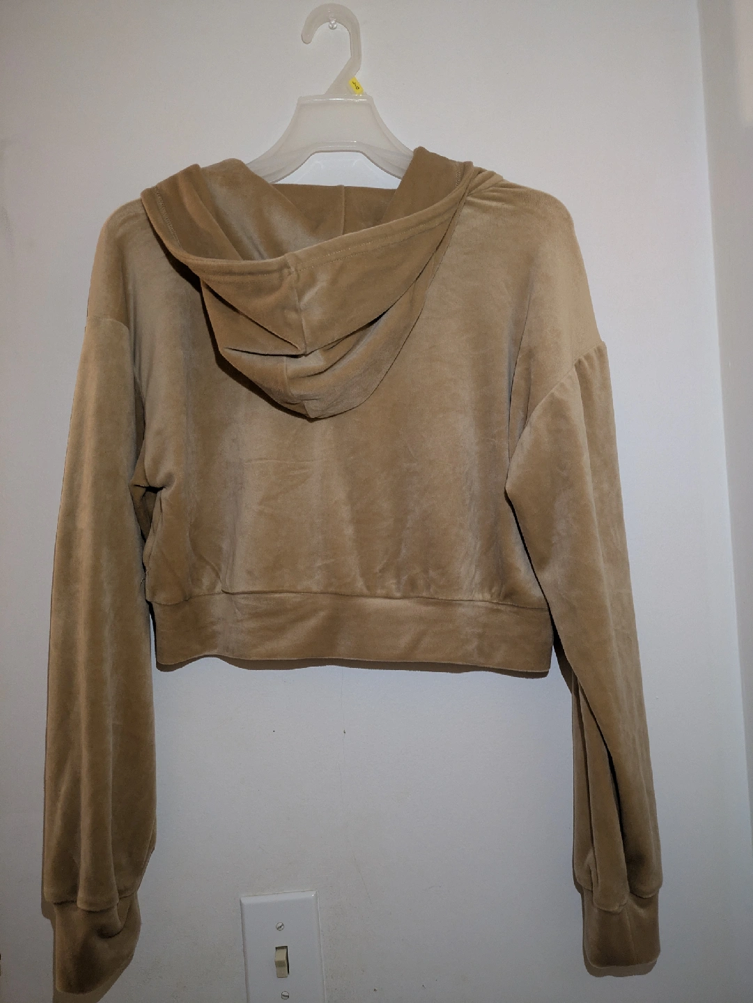 Cozy Ardene velour cropped hoodie in a beautiful tan colour! It's a size Medium and in great condition. Perfect for layering or wearing on its own. The material is soft and comfortable, great for everyday wear