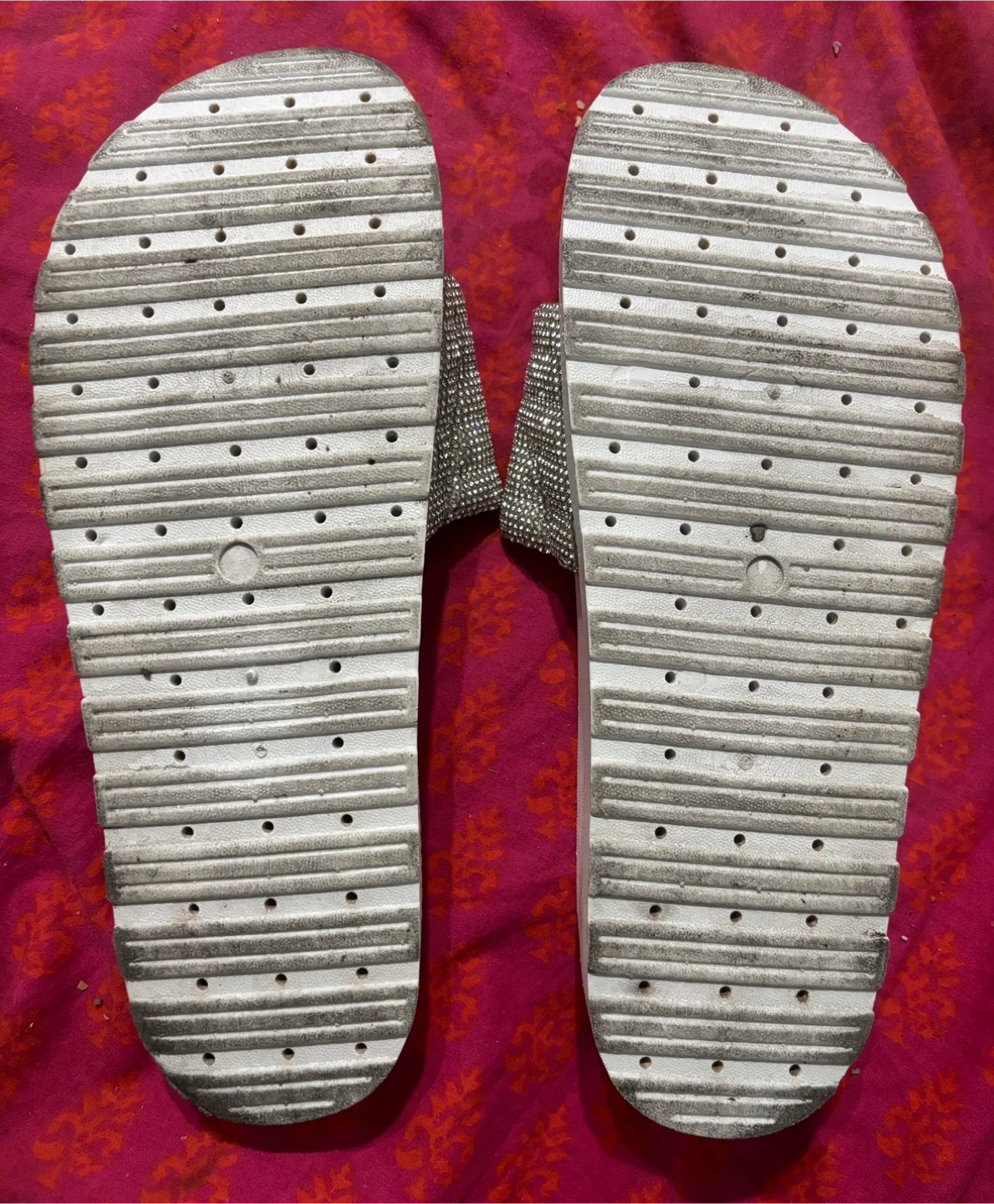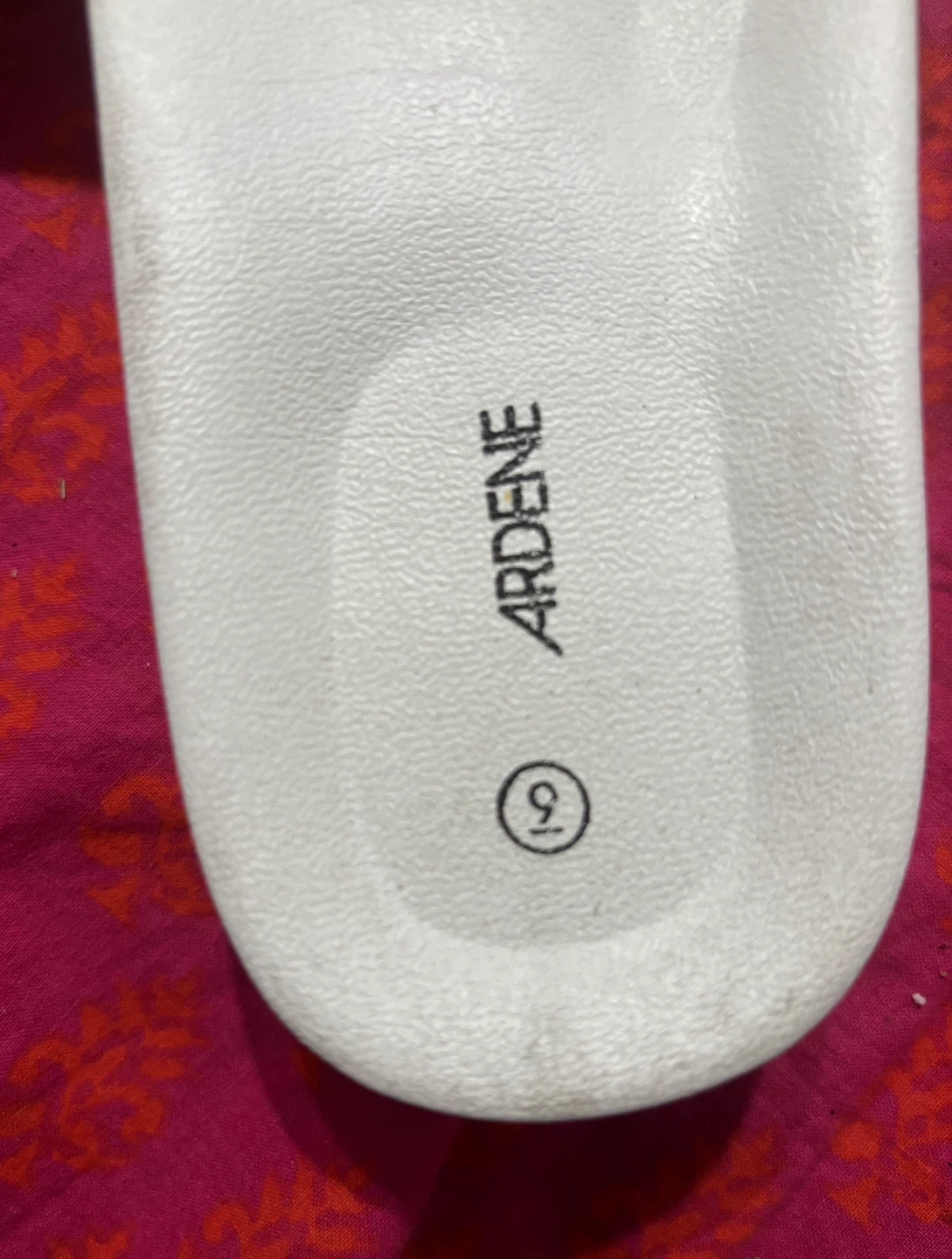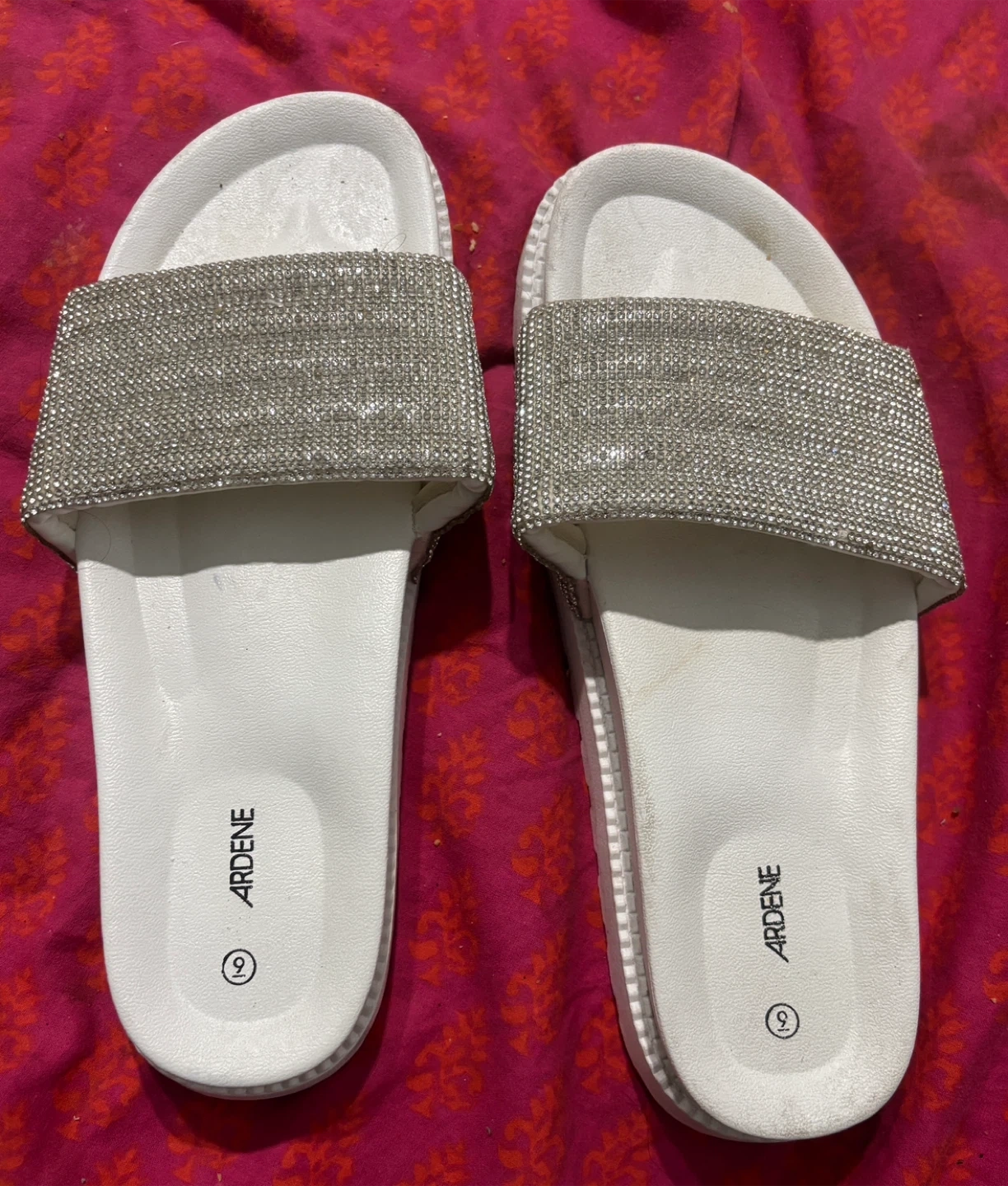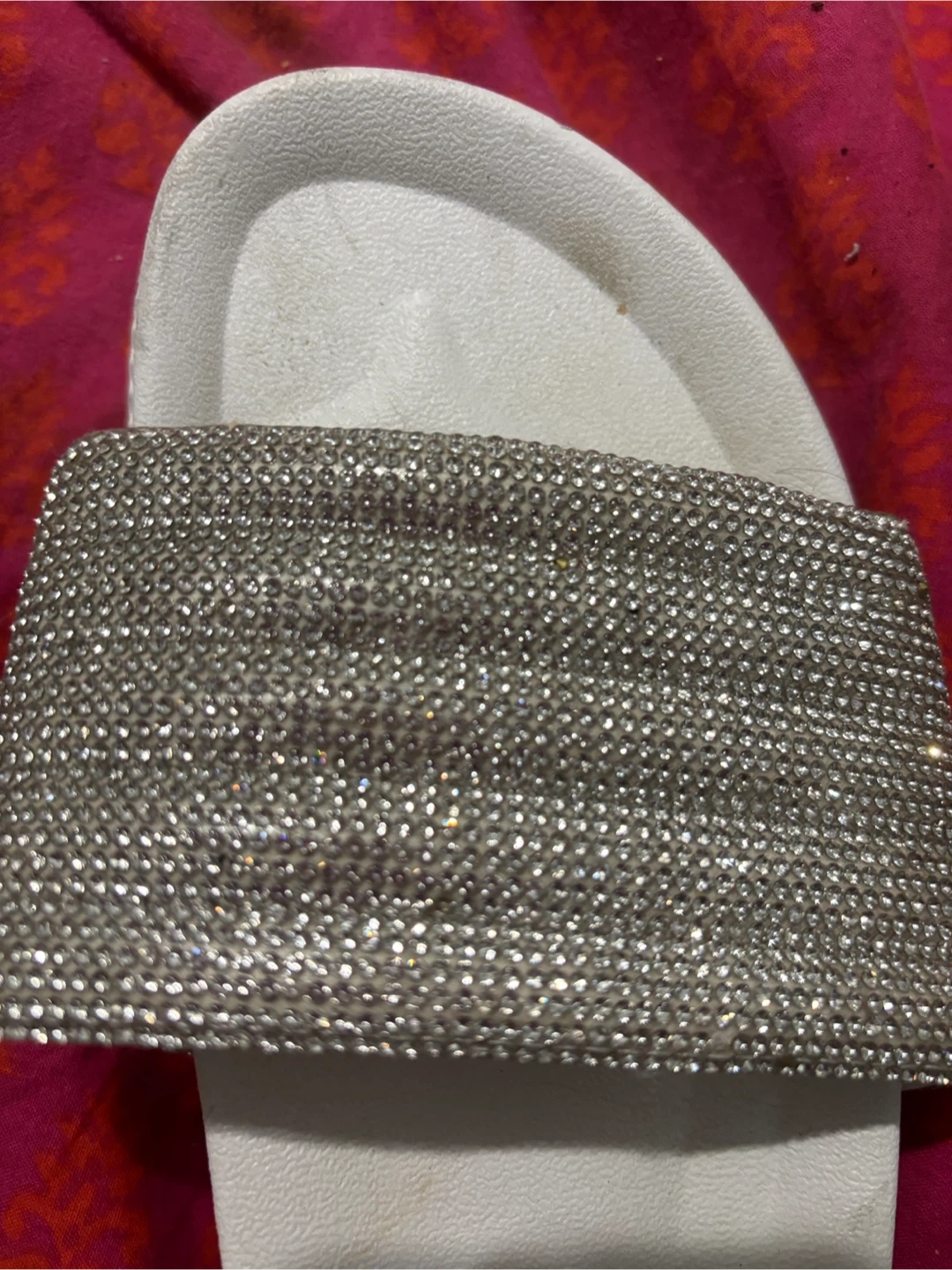 Selling a pair of Ardene white slides in size 9. They feature a sparkly rhinestone band across the top. These are perfect for adding a bit of bling to your casual outfits. They are in good condition as shown in photos