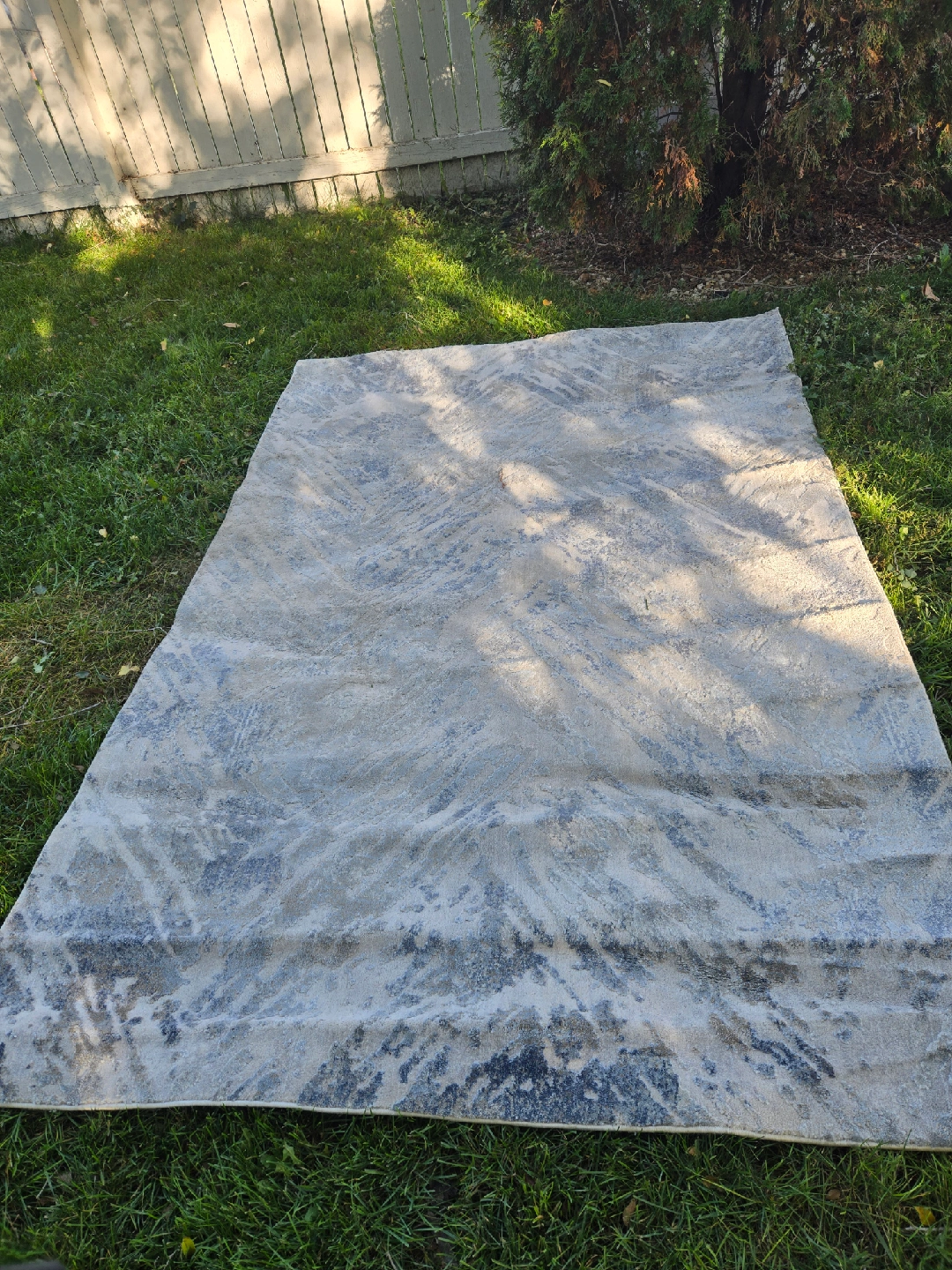Gently used area rug with a stylish grey and blue pattern. It's in great condition and ready to add some flair to your space! measures 5 '3" by 7'7"