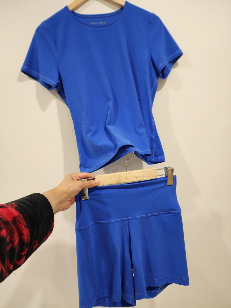 Selling an Aritzia Golden set in a vibrant blue! The set includes a top (size L) and shorts (size 8). Perfect for workouts or casual wear!