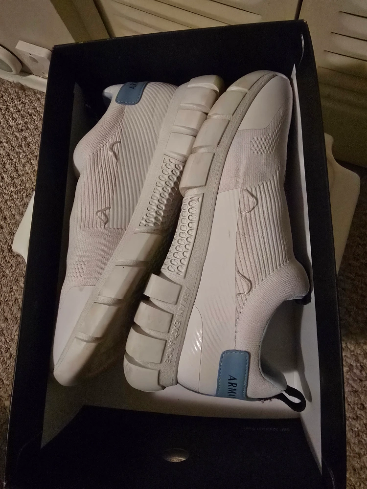 Selling a brand new pair of Armani Exchange sneakers! These are a size 10M (US). They're white with sky blue accents and come in the original box. The item number is XDX083 XV419 K656