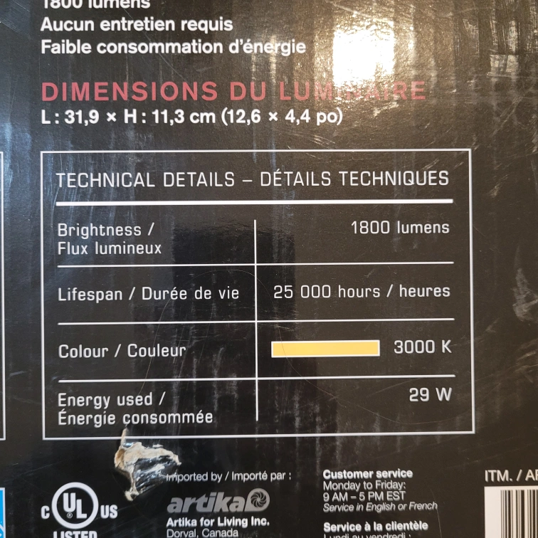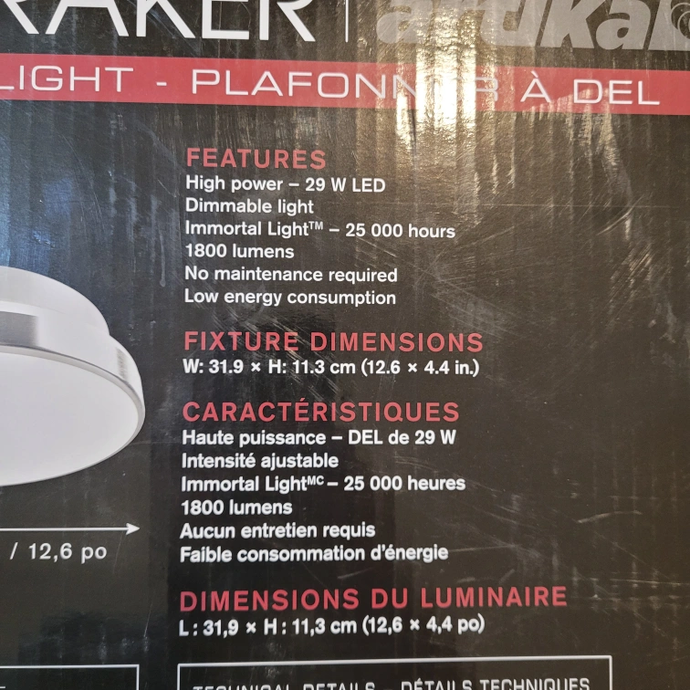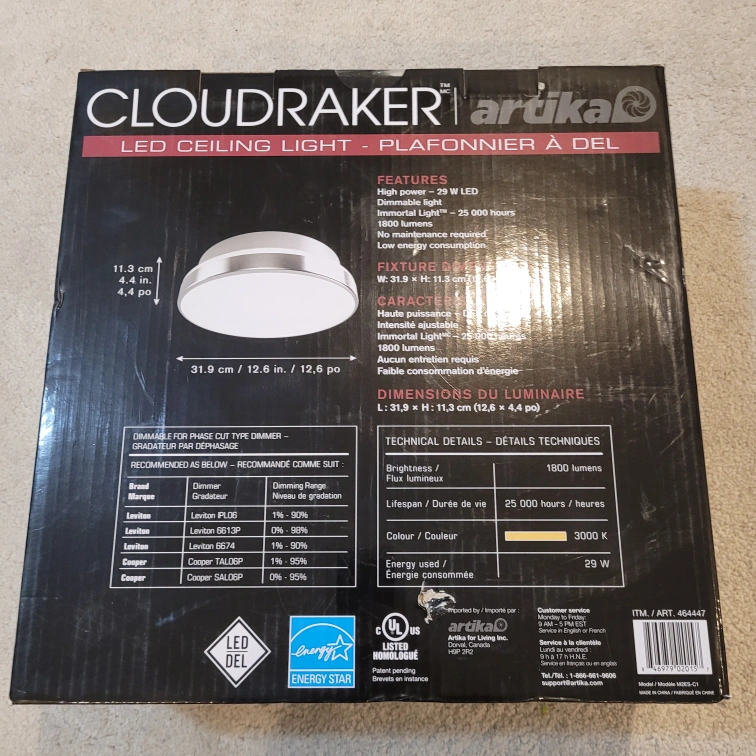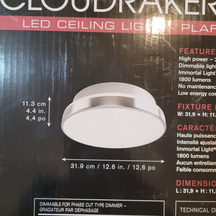 Artika Cloudraker LED ceiling light. It's a dimmable light with high power - 29W LED and 1800 lumens. Brand New - Immortal Light - 25 000 hours - No maintenance required - Low energy consumption Fixture dimensions: W: 31.9 x H: 11.3 cm (12.6 x 4.4 in) Pick up from Avalon Orleans.