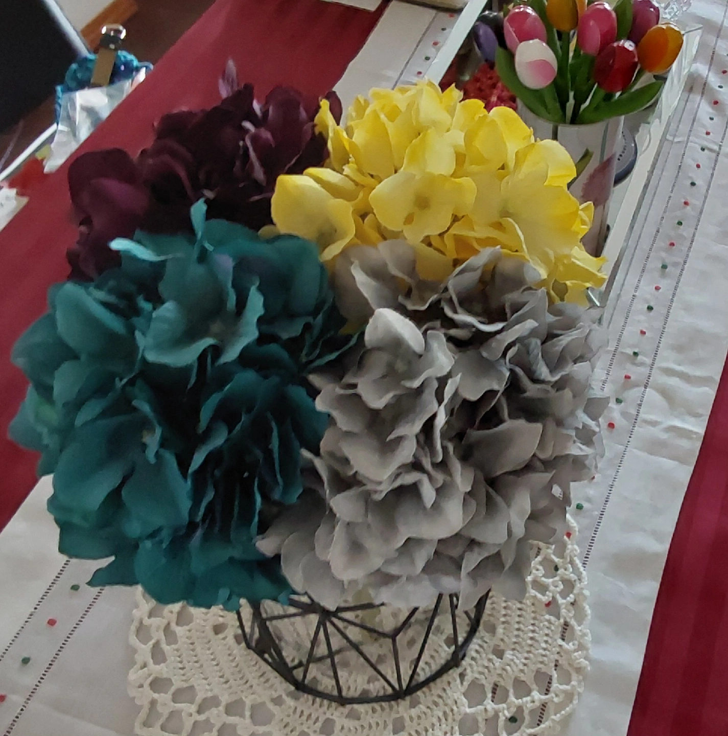 Purchased these awesome decoratve vase with faux hydrangea at Urban Barn. Selling a stylish geometric black metal vase with a glass insert! It's perfect for displaying flowers or greenery and adding a modern touch to your home decor. The vase is in pristine condition and ready to find a new home.