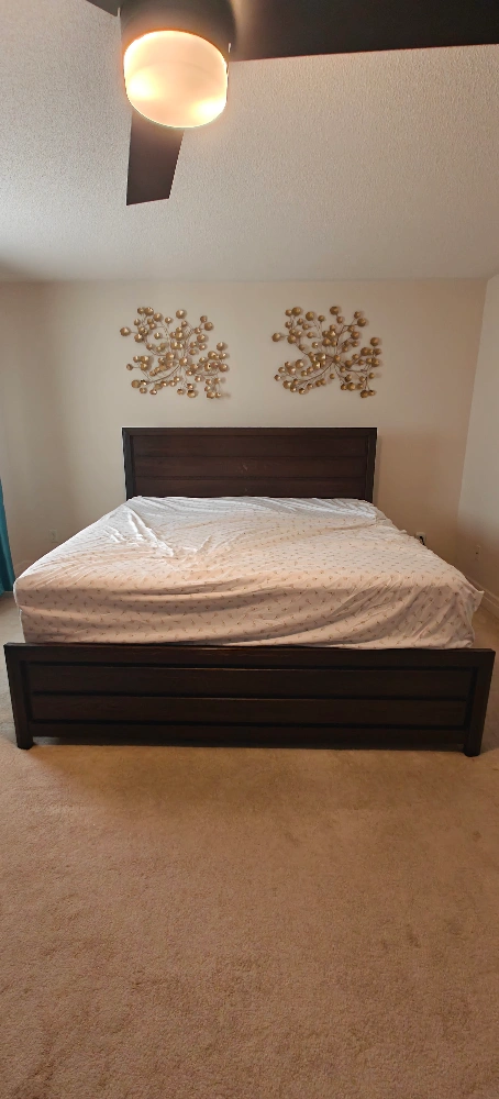Selling a king complete bedroom set! Includes a bed frame, a large dresser with six drawers, and two matching nightstands. The set is a dark brown colour and in good condition. Perfect for furnishing a new space or upgrading your current bedroom setup