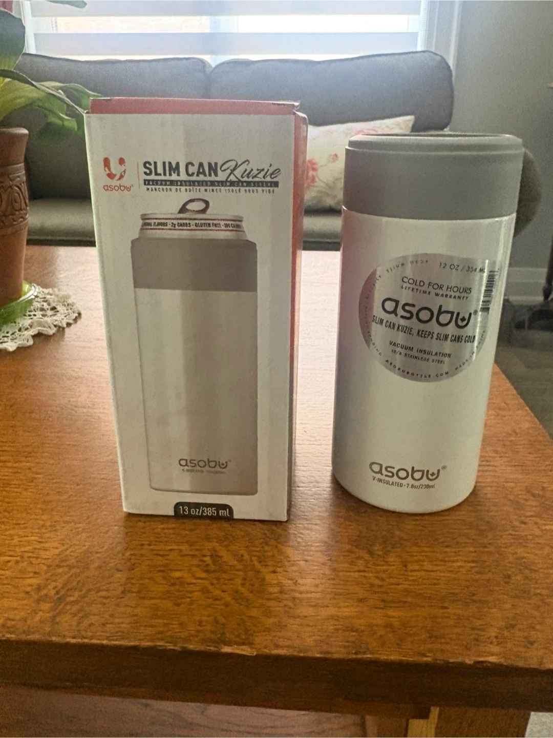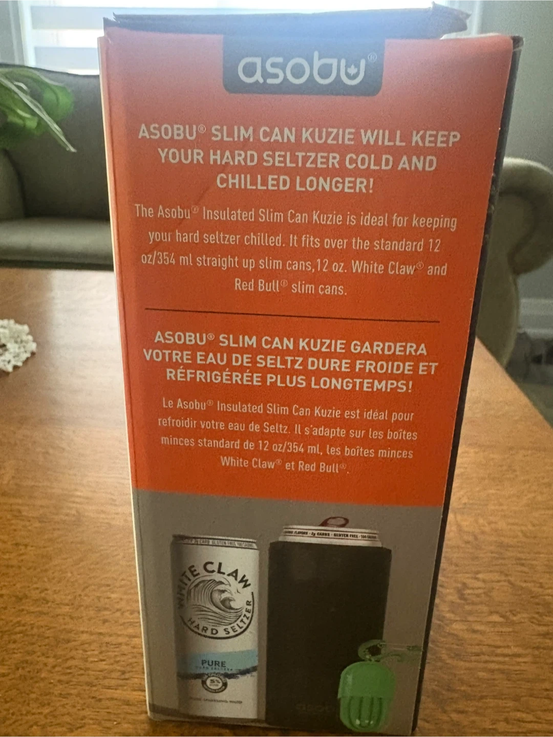 Keep your hard seltzer or other slim cans chilled with this Asobu Slim Can Kuzie! It's designed to keep your drinks cold for hours. It fits standard 12 oz / 354 ml slim cans like White Claw and Red Bull. Comes with the box and a reusable silicone drinking straw!