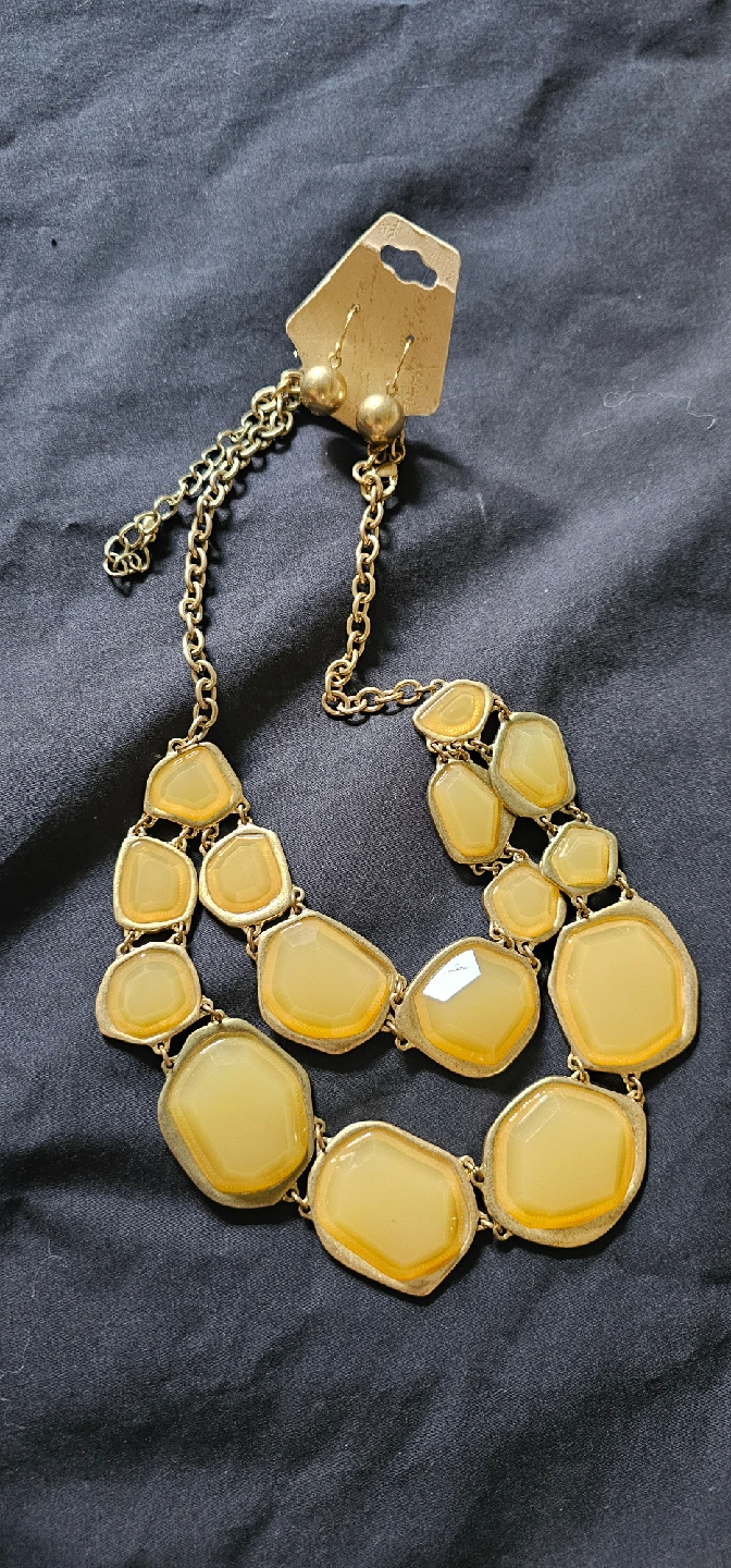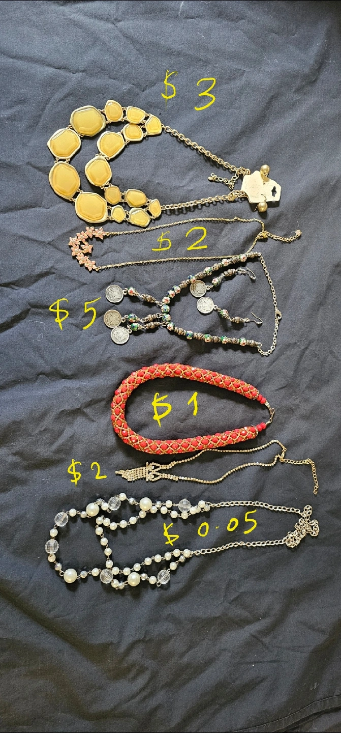 Brand new some and some used. A selection of costume necklaces, each with its own unique style! There's a yellow stone necklace, a beaded necklace with coin pendants, and a rhinestone necklace, among others. Perfect for adding a bit of flair to any outfit