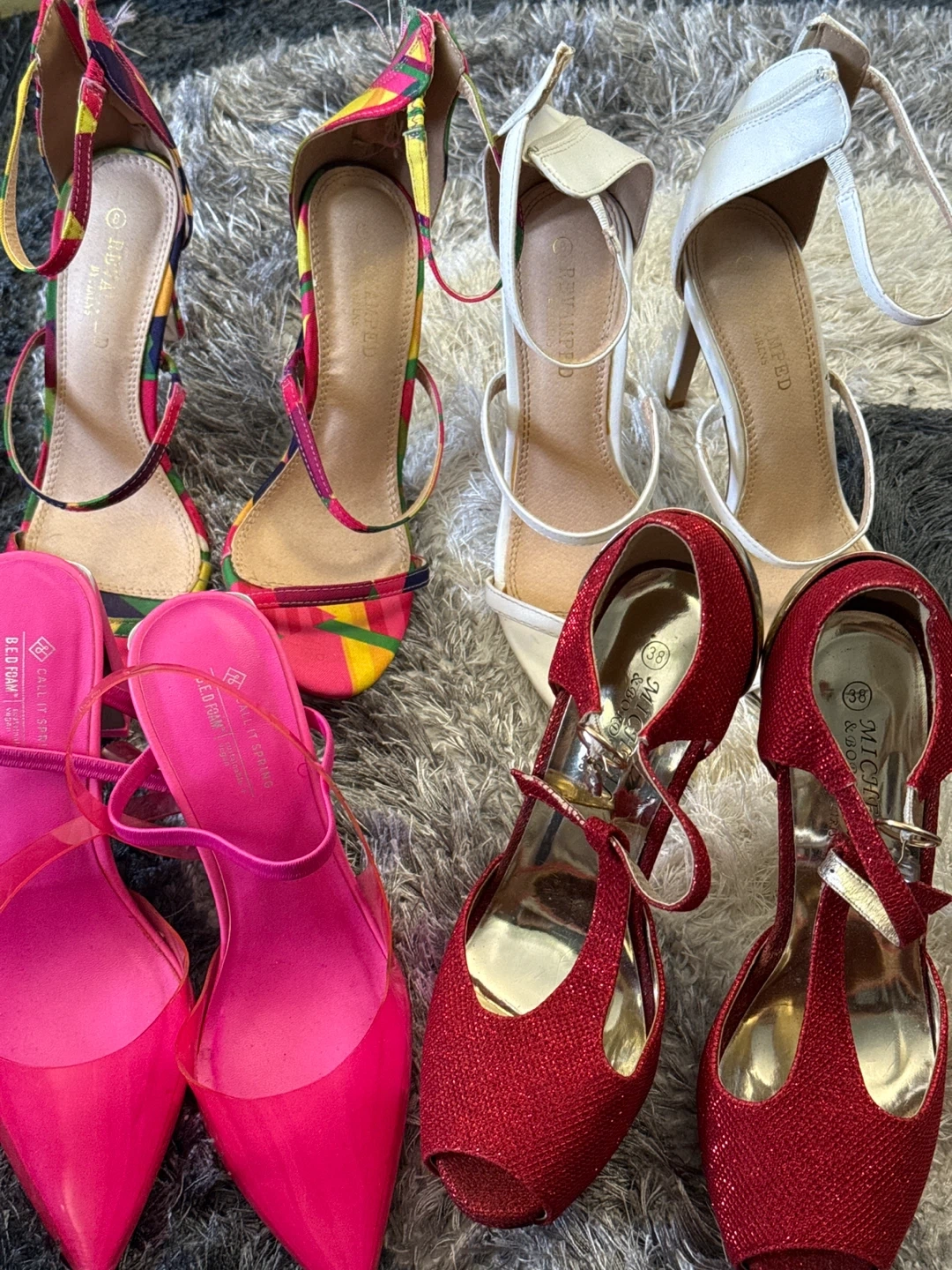 Selling a collection of heels in various colours and styles! Brands include Revamped, Call It Spring, and Michael & Bord. The red glitter heels are a size 38. Perfect for adding some flair to your wardrobe