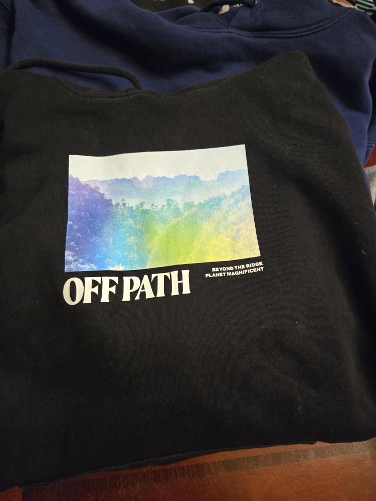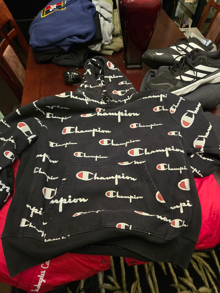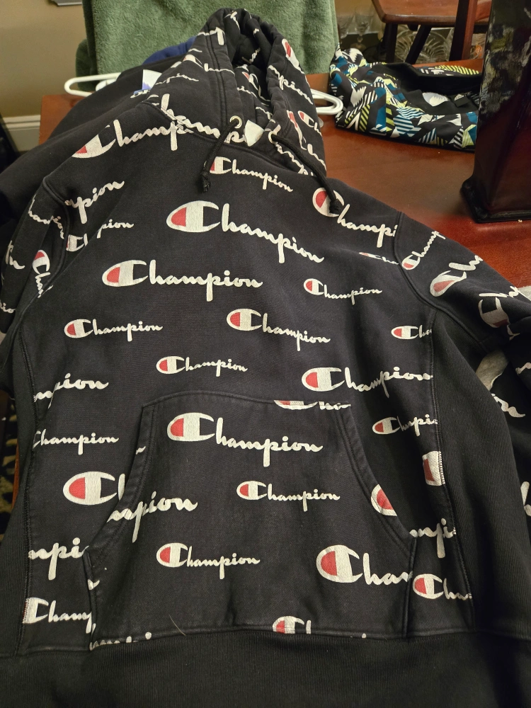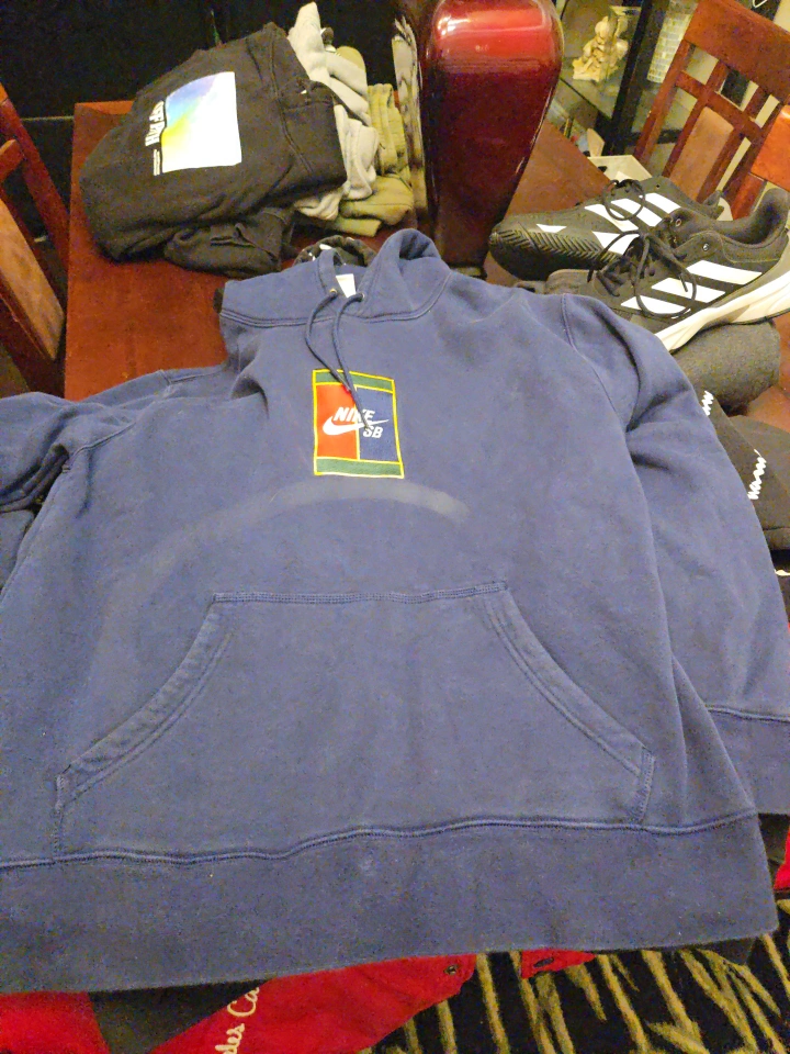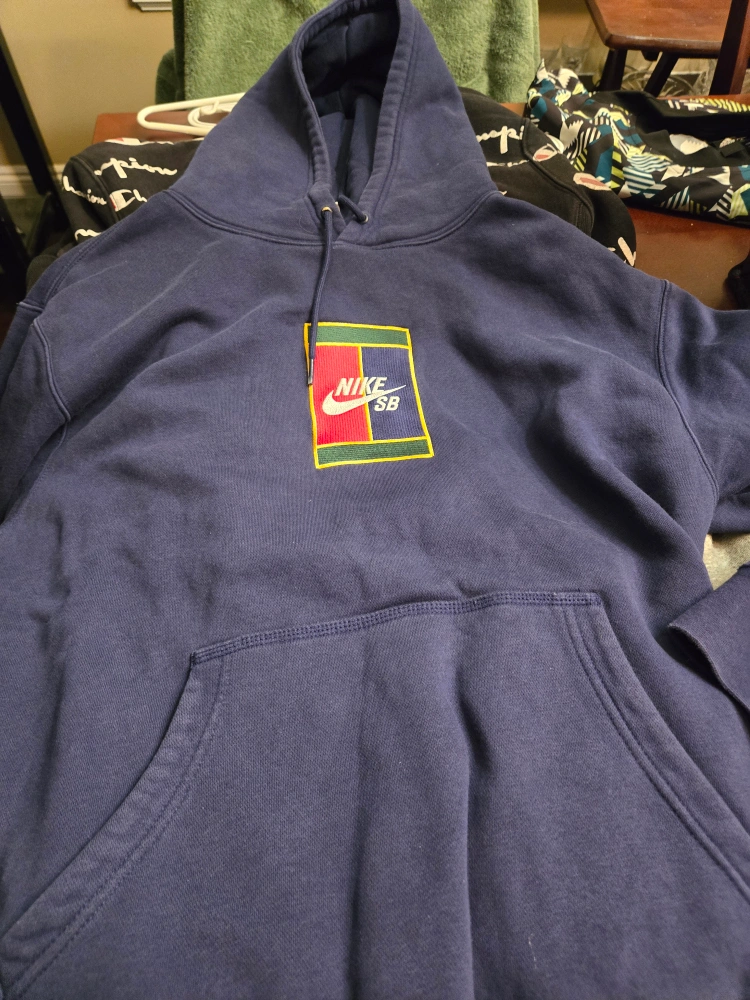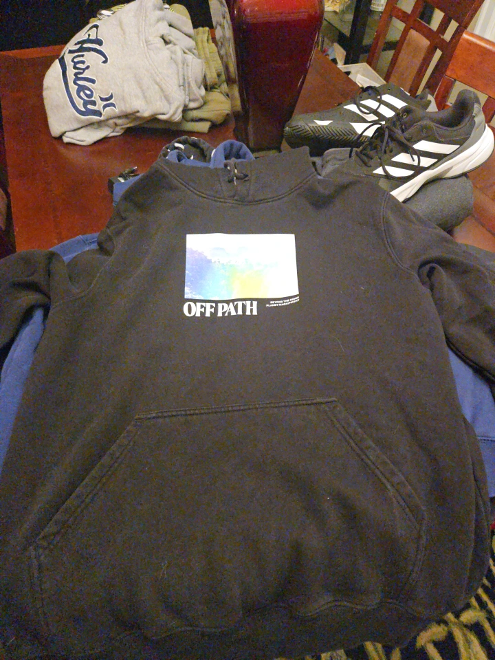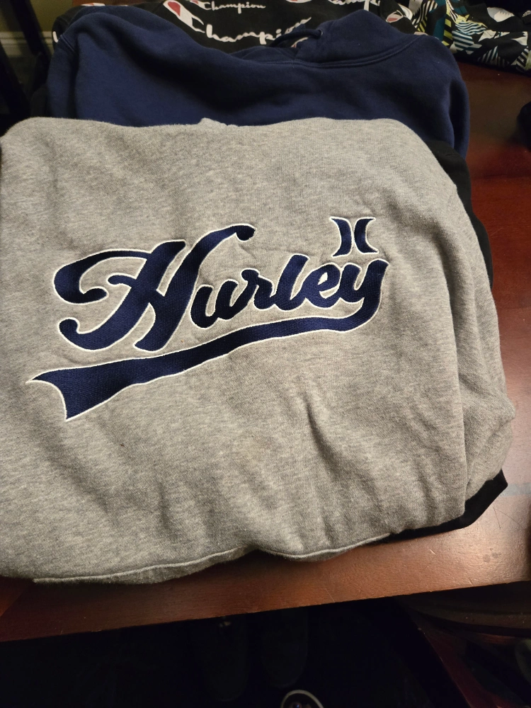 Selling a variety of hoodies from different brands. There is a Champion hoodie with an all-over print, an Off Path hoodie with a mountain graphic, a grey Hurley hoodie, and a blue Nike SB hoodie. They are all in great condition.