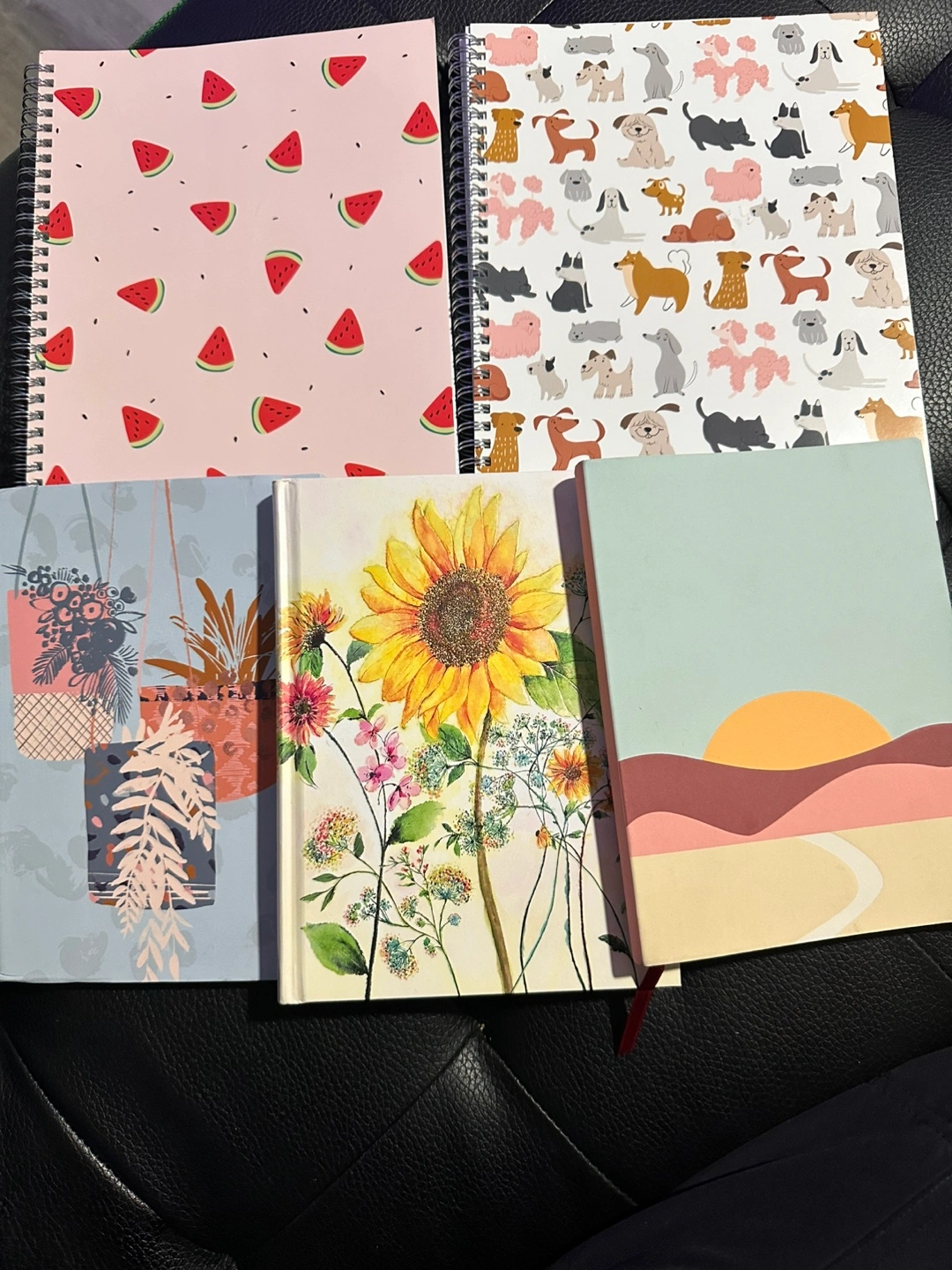 Selling a collection of cute journals! There's a variety of designs including watermelons, dogs, plants, sunflowers, and a desert landscape. Perfect for writing, drawing, or note-taking!