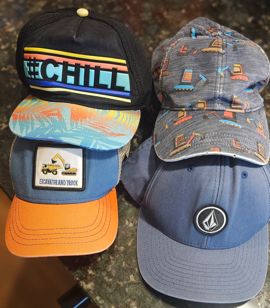 Selling a bundle of four kids' baseball caps in good condition! There's a mix of fun designs, including a #Chill cap, one with excavator and truck, and a Volcom hat. All have adjustable straps for a comfy fit. All 4 for $15