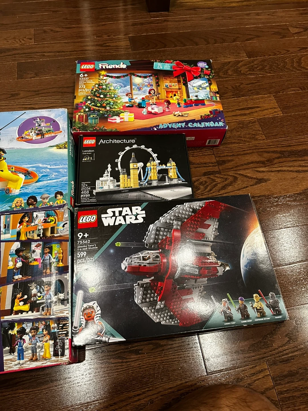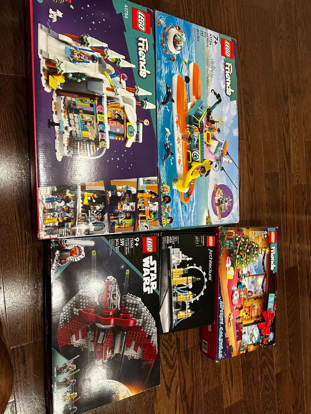 Condition: All sets are brand new, sealed. Only the LEGO Friends Boat has a damaged box (contents are perfect). Sets Available: • LEGO Friends Ski Chalet (41756) – $55 • LEGO Friends Rescue Boat – $55 (box damaged) • LEGO Star Wars Sith Infiltrator – $50 • LEGO Friends Advent Calendar – $20 • LEGO Architecture London Skyline – $25 Bundle Deal: Take all 5 sets together for $170 (best value).