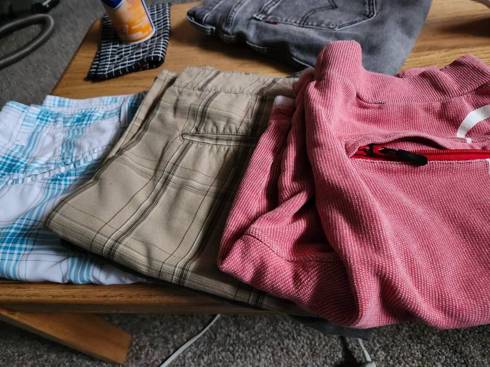 Selling a variety of men's shorts! There's a light blue and white plaid pair, a tan plaid pair, and a red pair with a zipper pocket detail. Perfect for summer!