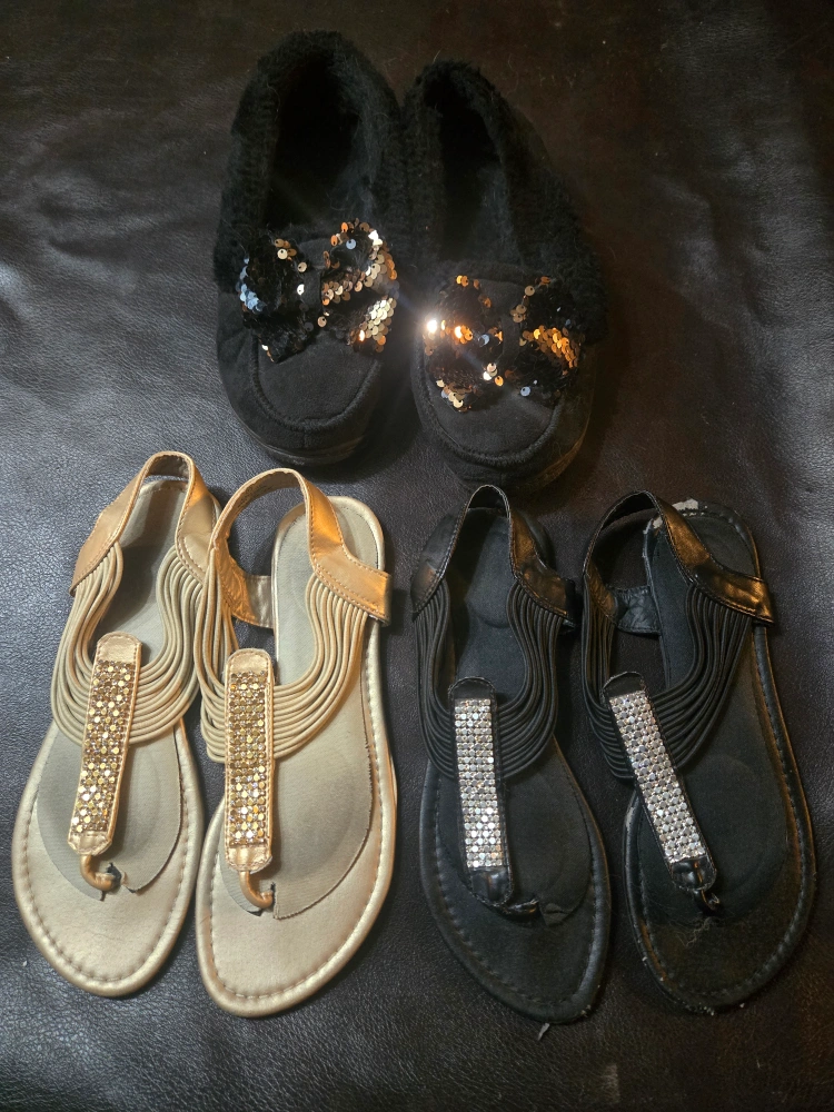 A collection of gently used sandals and slippers. There are two pairs of flip-flop style sandals, one in gold and one in black, both with decorative embellishments. Also included is a pair of black slippers with sequin bows. Perfect for around the house or a casual outing!
