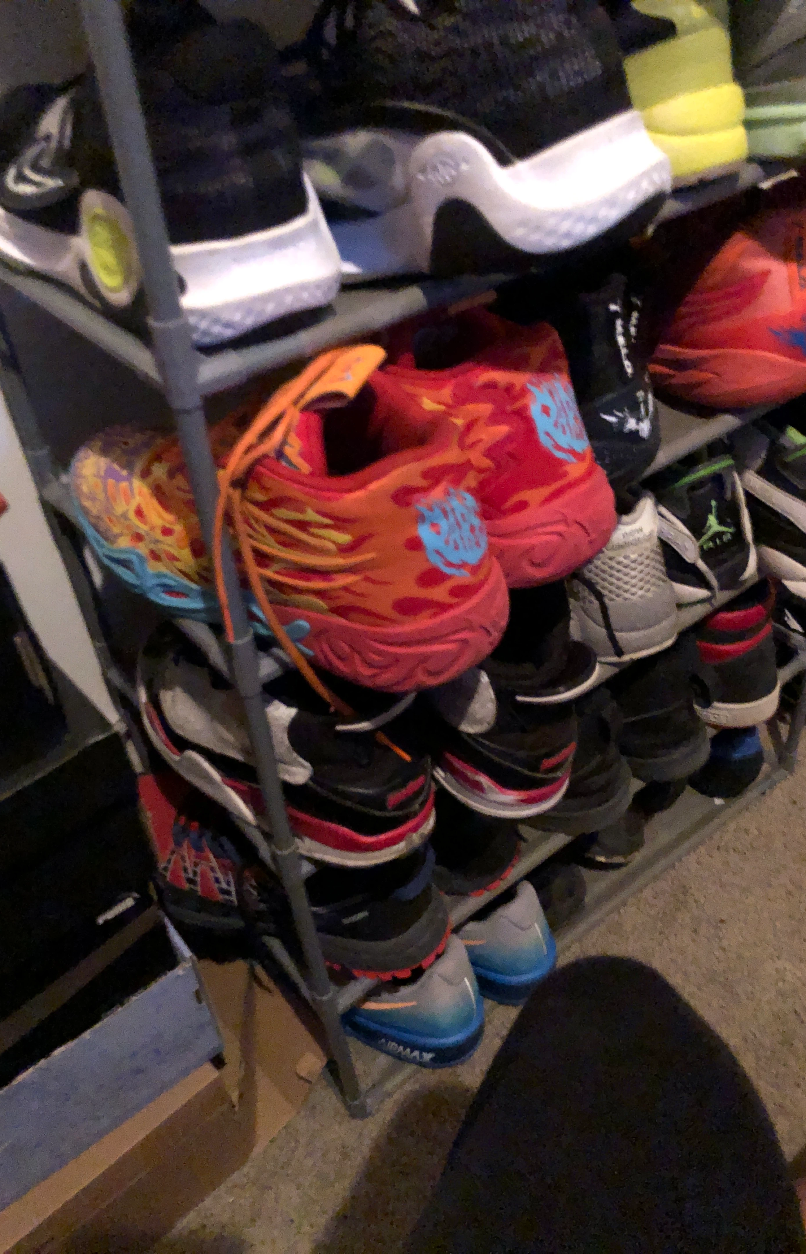 A variety of shoes are available on the rack. There are different colors and styles to choose from