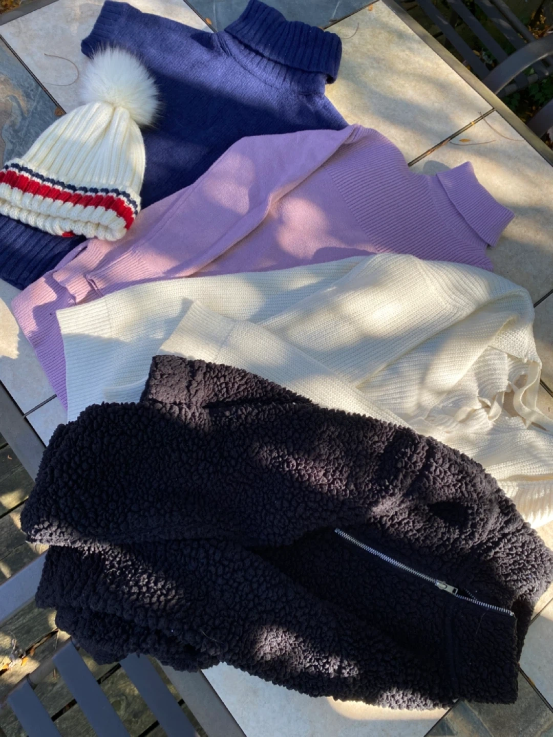 Selling a bundle of sweaters and a hat. There's a navy blue turtleneck, a light purple sweater, a white cardigan-style sweater, a black sherpa quarter-zip, and a white toque with red and navy stripes and a pompom! All in good condition and ready for a new home