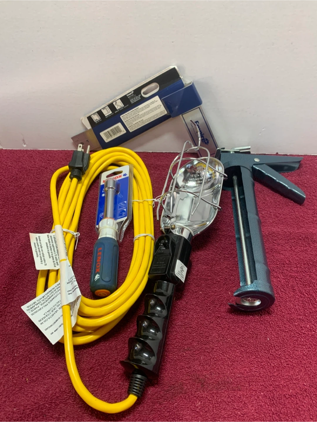 Assorted tools, all new Trouble light. - $20 Try-Square. - $12 Caulking gun. - $5 Lenox 9/16 nut driver. - $10 $40 for everything Pickup in Bolton