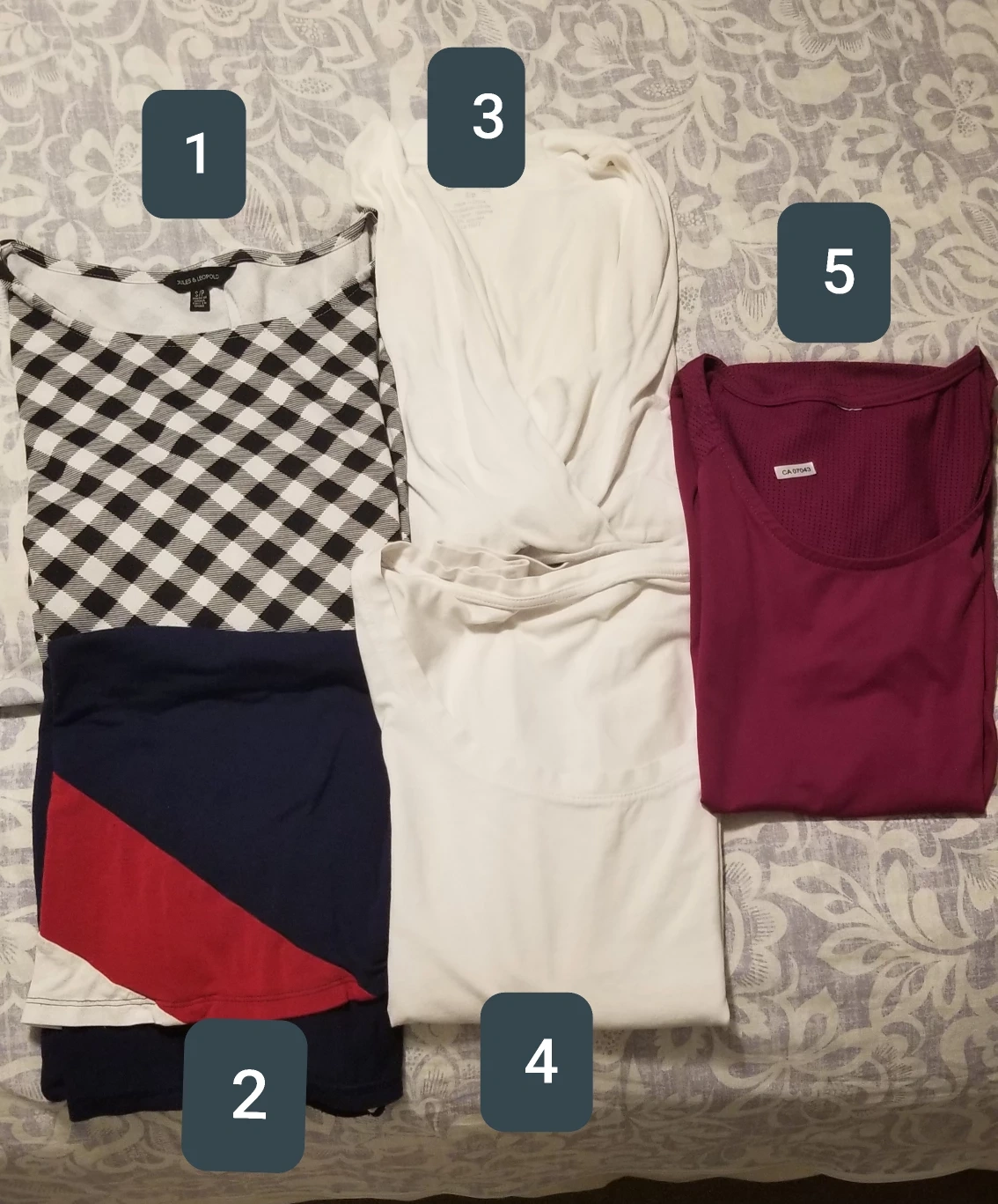 Assorted.top various size Ad 2 Take All 5 top for $5 firm price Cannot add more than 10 pictures Overall condition is Okay there is discoloration in sleeves armholes I have posted pictures in both ads NOTE: Shirt 3 not bright white and Shirt 1,3 and 4 sleeves armholes has staining Shirt 5 has a mesh breathable back I can send puctures upon request Pet free and smoke free home. Pick up only at Yonge & Eglinton Centre ( Sephora Entrance) 2300 Yonge St,Toronto M4P 1E4 Please check parking in advance. Paid parking is available at Yonge and Eglinton Centre. Only Cash payment accepted. If the Ad is up it's available. Thank you.