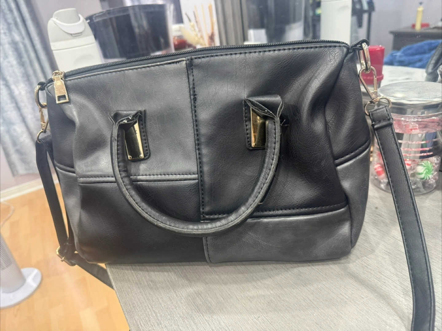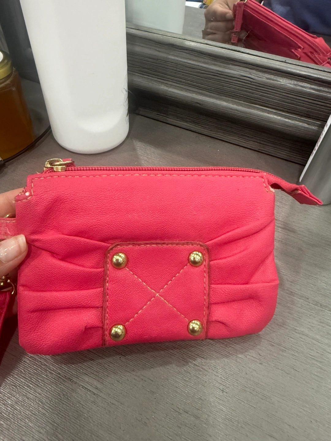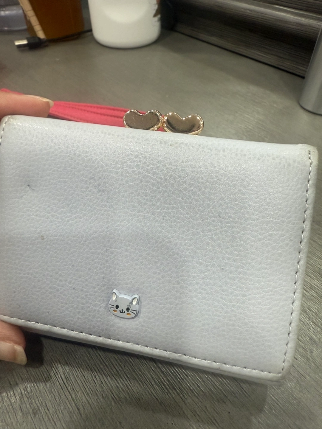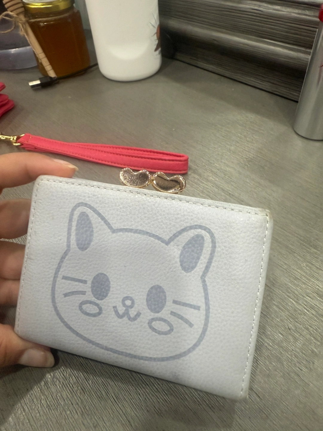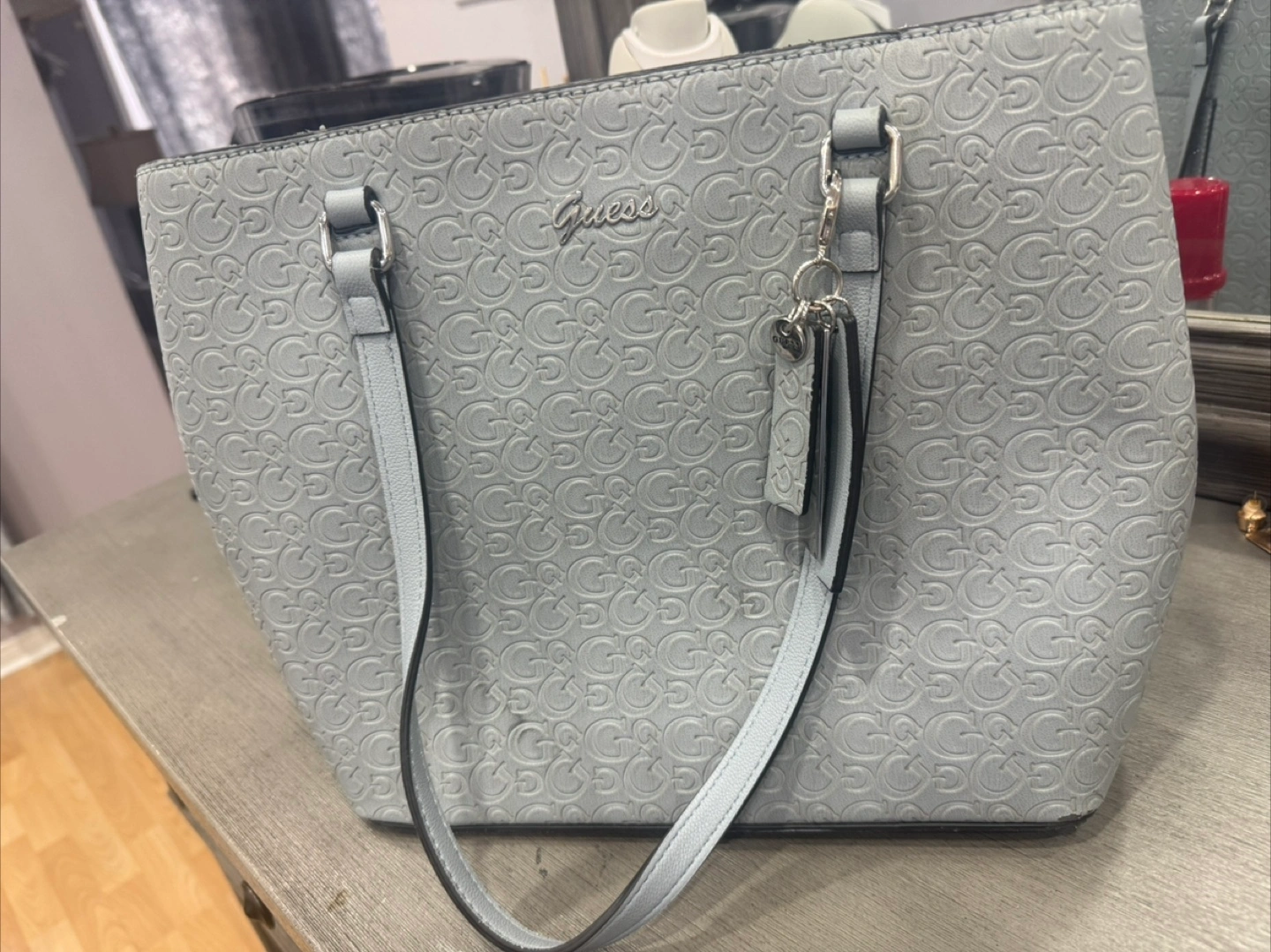 I'm selling a few different handbags and wallets. They're all in used condition, but still have lots of life left! There's a light blue Guess tote bag, a black handbag, a small white wallet with a cat face, and a small pink wallet