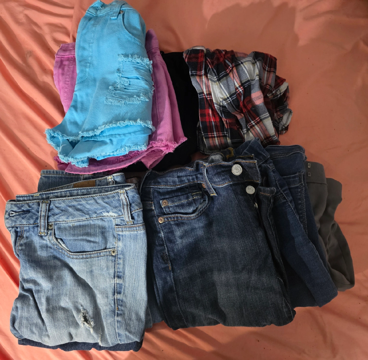 Selling a bundle of assorted women's clothing. Includes jeans, shorts, and a flannel top. All items are in used/like new condition.