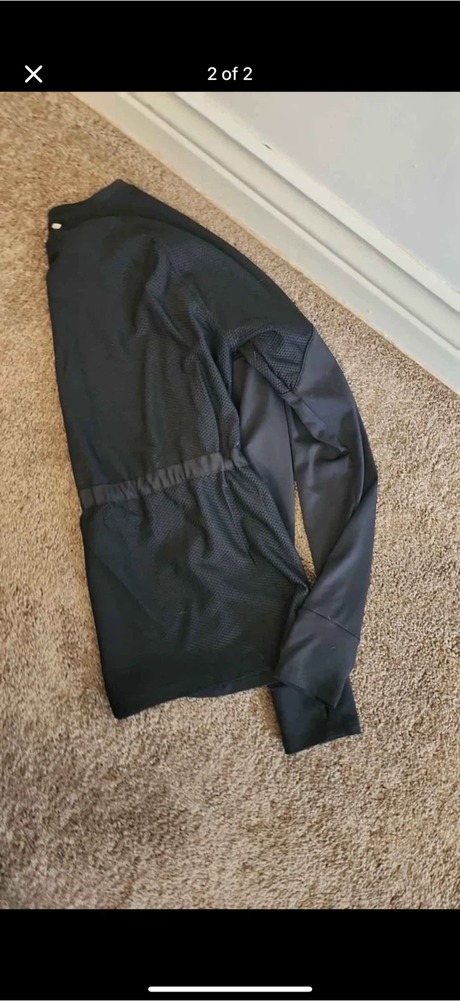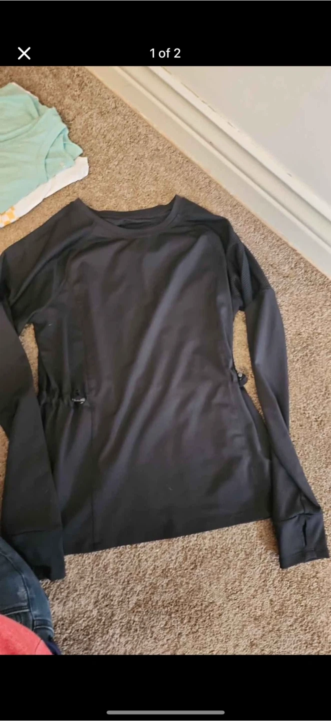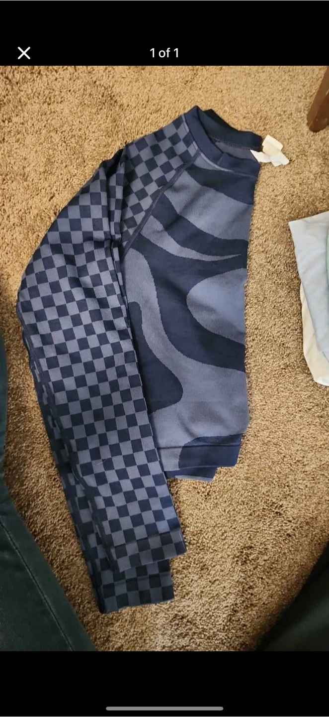 long sleeve top, featuring a unique checkered pattern on one sleeve and a wavy design on the body. It's in great condition and ready for your next workout or casual outing! Crop style. Black athletic top size medium has a adjustable waist
