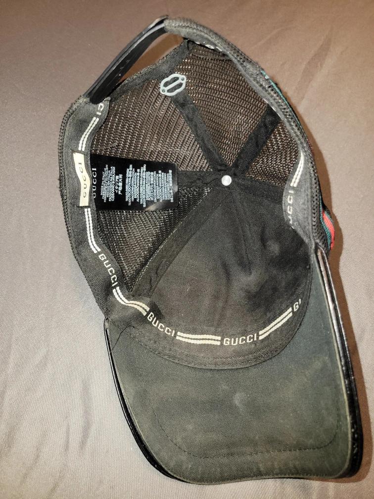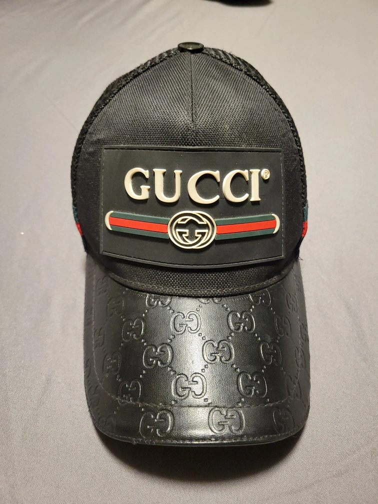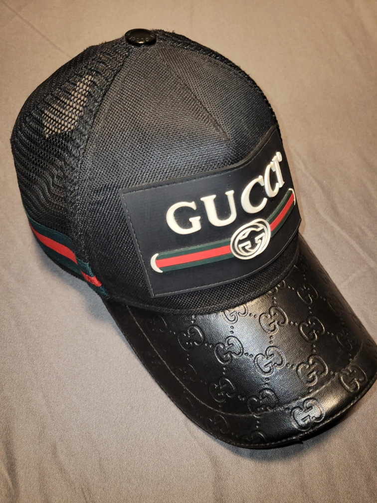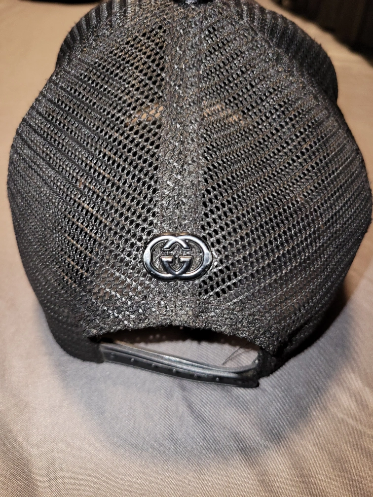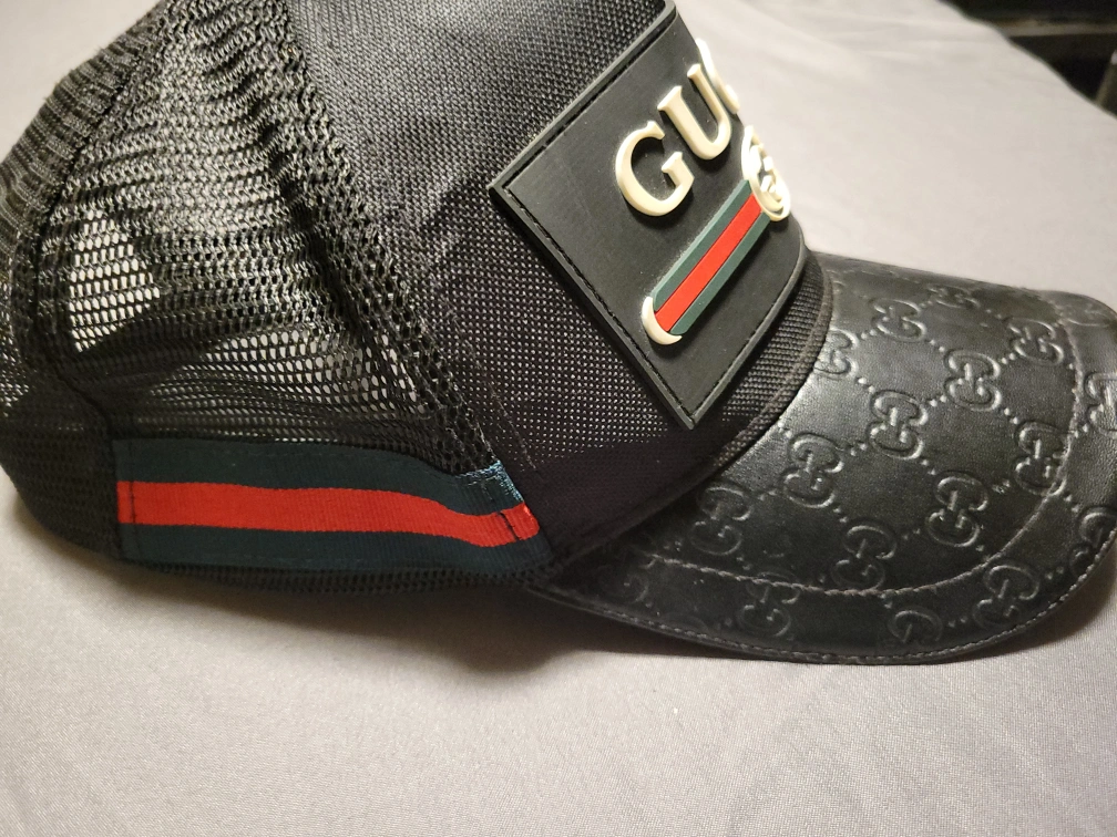 Selling a black Gucci trucker hat. It features the Gucci logo prominently on the front and has a mesh back for breathability. A stylish accessory to complete your look! Pickup Only