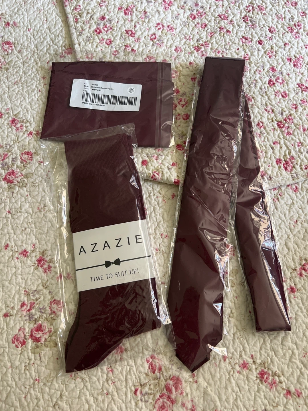 I have a brand new Azazie men's accessory set in the colour Cabernet! This includes a pair of socks, a tie, and a matte satin pocket square. Perfect for completing a sharp, coordinated look for any special occasion