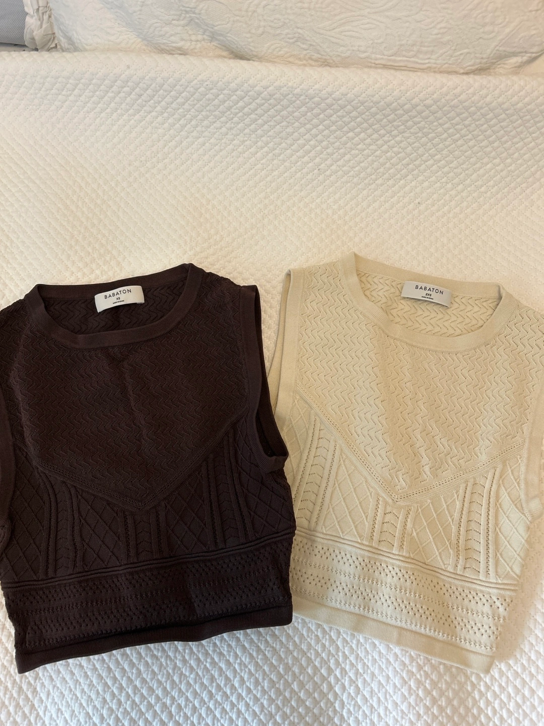 Selling two cute cropped sleeveless tops from Babaton! One is a size XS in a chocolate brown, and the other is a size 2XS in a cream colour. They're in great condition and perfect for layering! Length: 13”. Not much difference in size. Can be sold separately for $30 each.