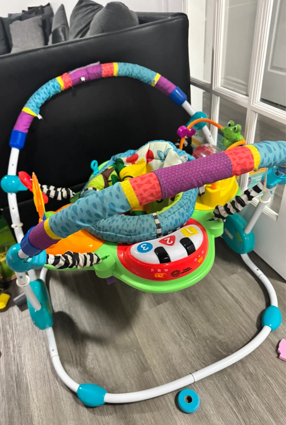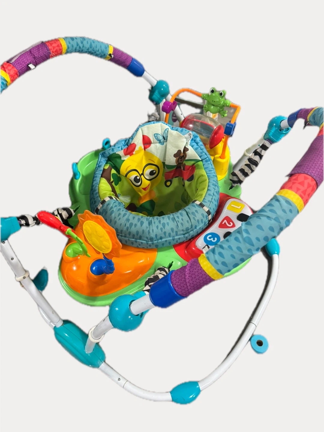 - interactive toys - music/sounds available -baby activity center - baby bouncer - seat rotates entirely! - very good condition Great for helping the baby to start jumping and moving a bit but also playing and interacting with toys!