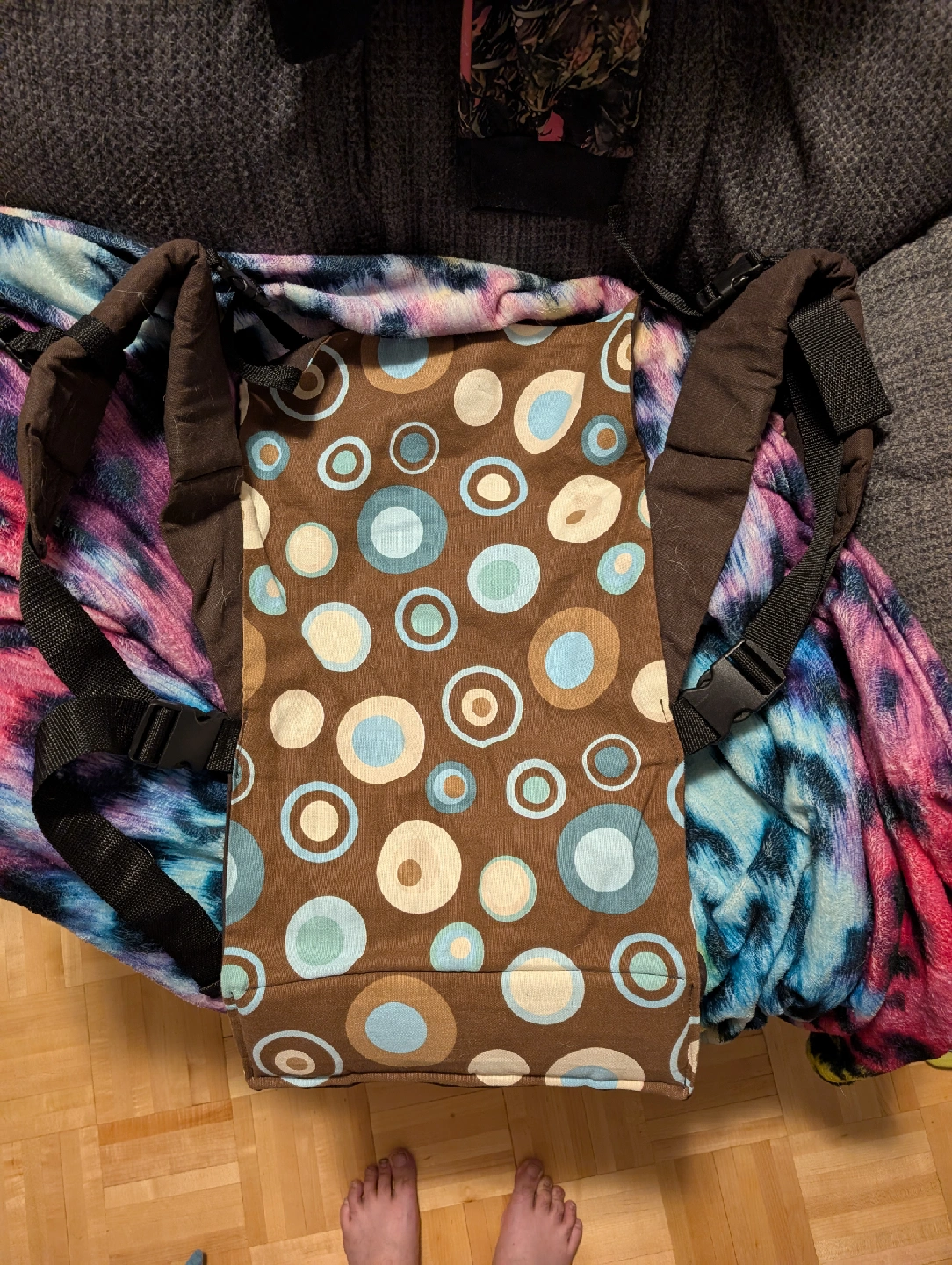 Selling a baby carrier with a fun brown and blue circle pattern! It has black straps and buckles for secure carrying. Perfect for keeping your little one close while you're on the go