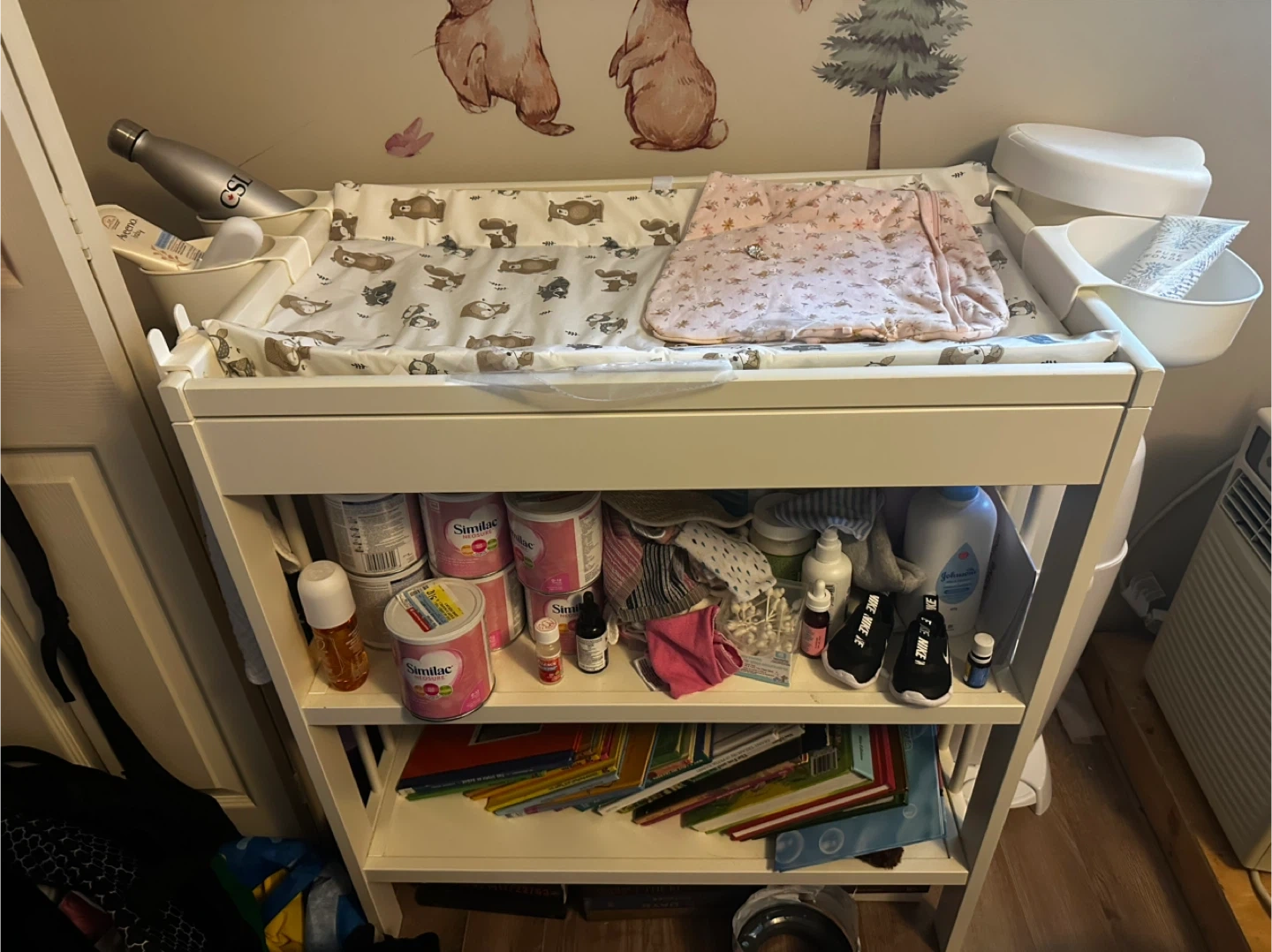 Selling a baby changing table. It's in great condition and has lots of storage space underneath for diapers, wipes, and other baby essentials. Perfect for keeping everything organized and within reach during diaper changes. Comes with the changing pad and clip on side compartments for wipes, towels,lotions and garbage