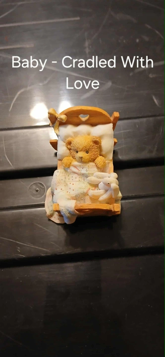 This is a charming "Baby - Cradled With Love" figurine, perfect for adding a touch of sweetness to any room! It features a cute teddy bear nestled in a cozy bed. It would make a lovely addition to a nursery or a thoughtful gift for a new parent