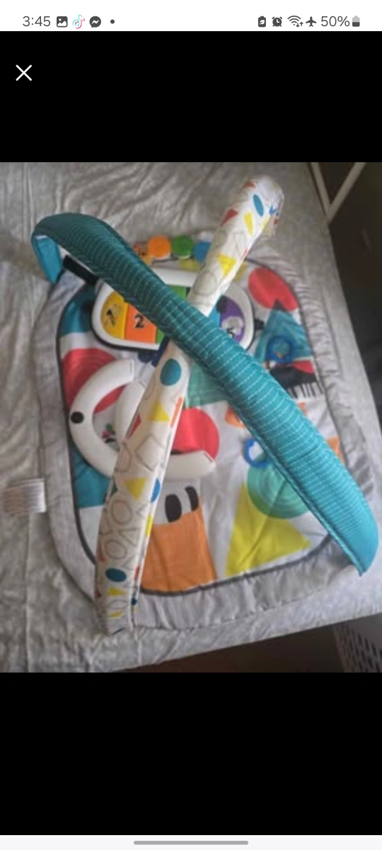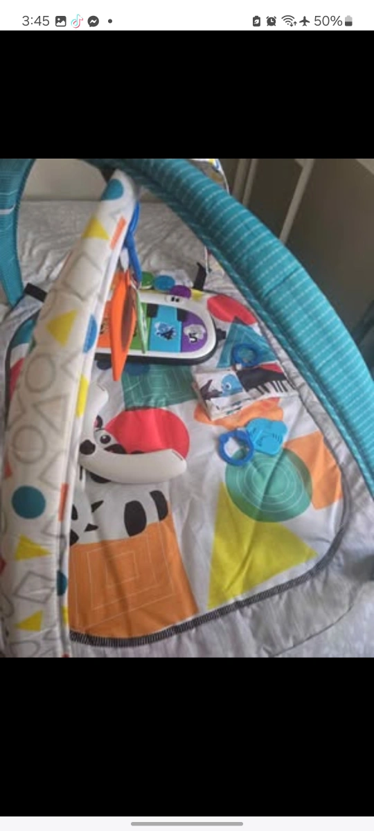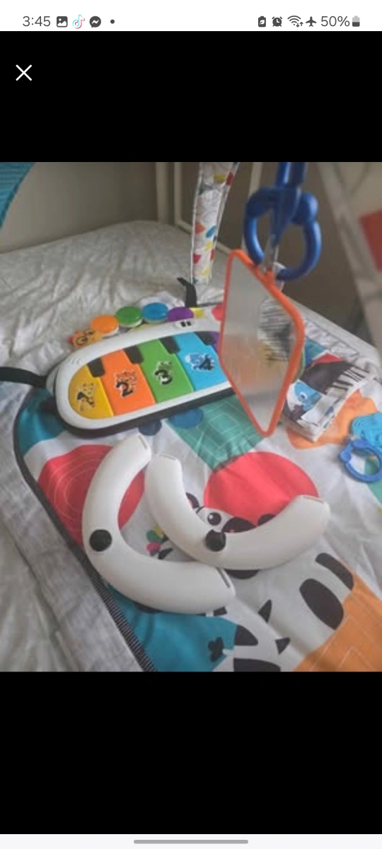 Baby activity gym. Includes piano, mirror, and teethers. Great for tummy time and playtime. Portable and easy to store.