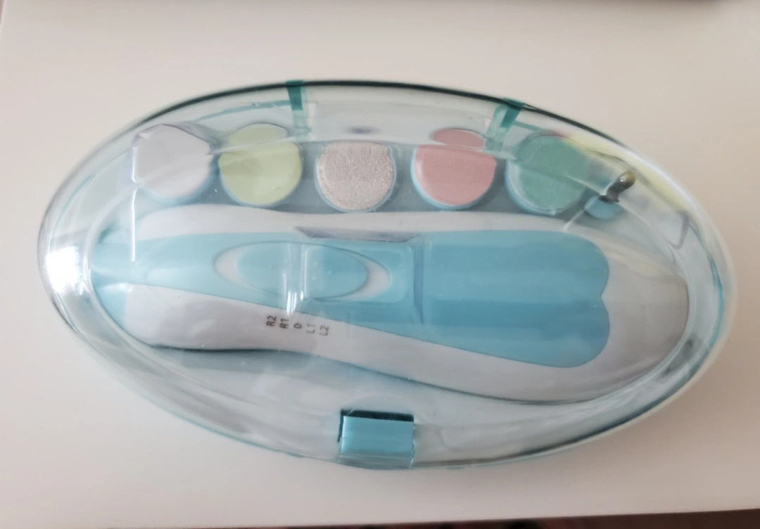 Gently trim your little one's nails with this electric nail file! It comes with different filing heads for different ages and nail types. The set is in excellent condition and includes the original case for easy storage and portability. Used it only a few times.