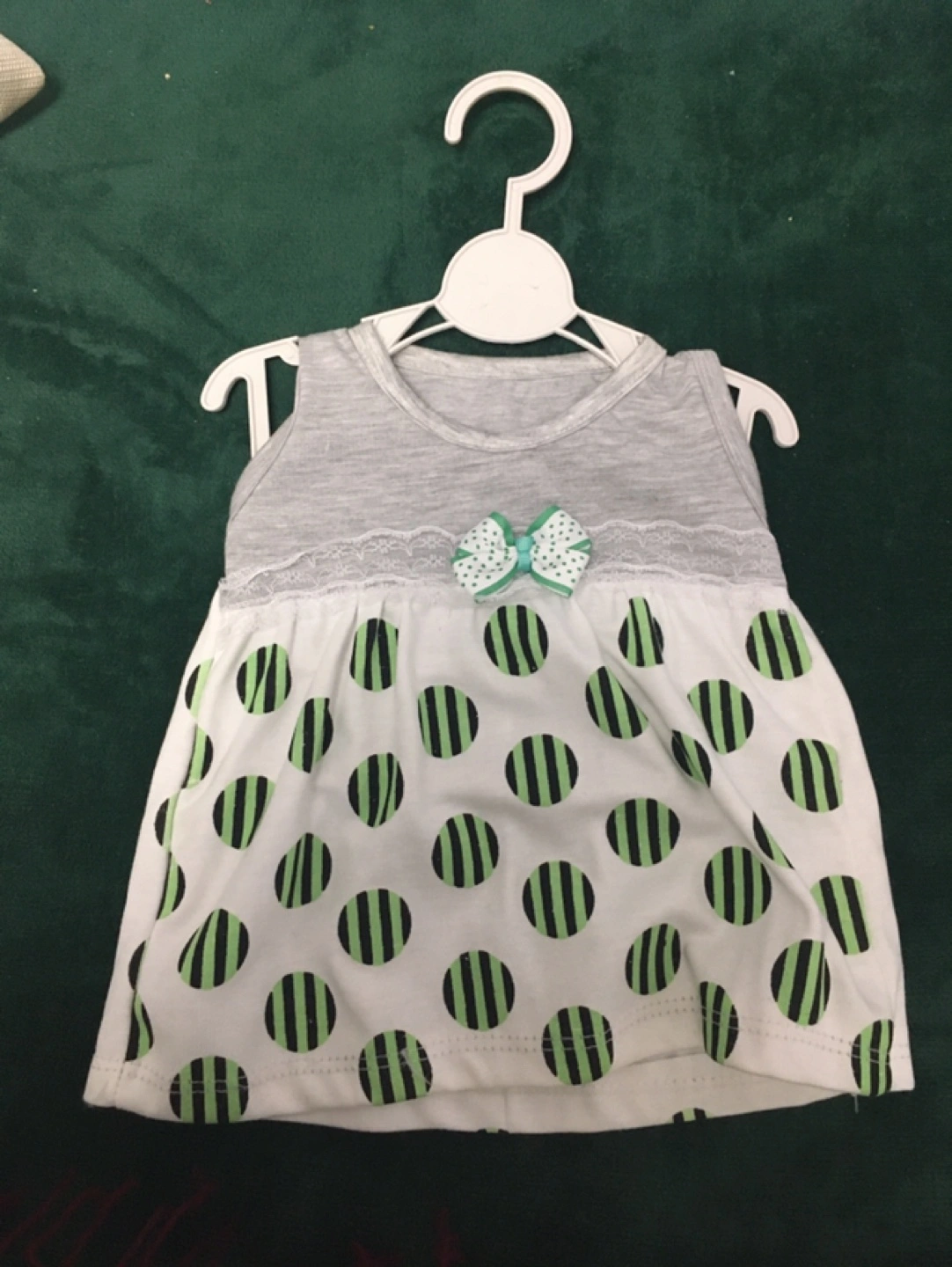 Super cute baby girl's sleeveless dress! It features a grey top and a white skirt with green and black polka dots. There's also a sweet little bow detail at the neckline. Perfect for your little one!