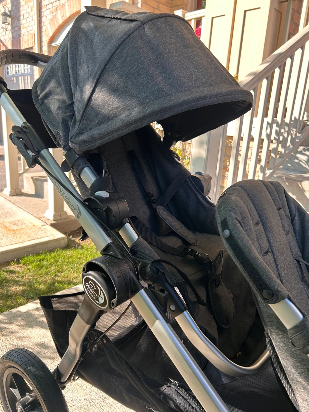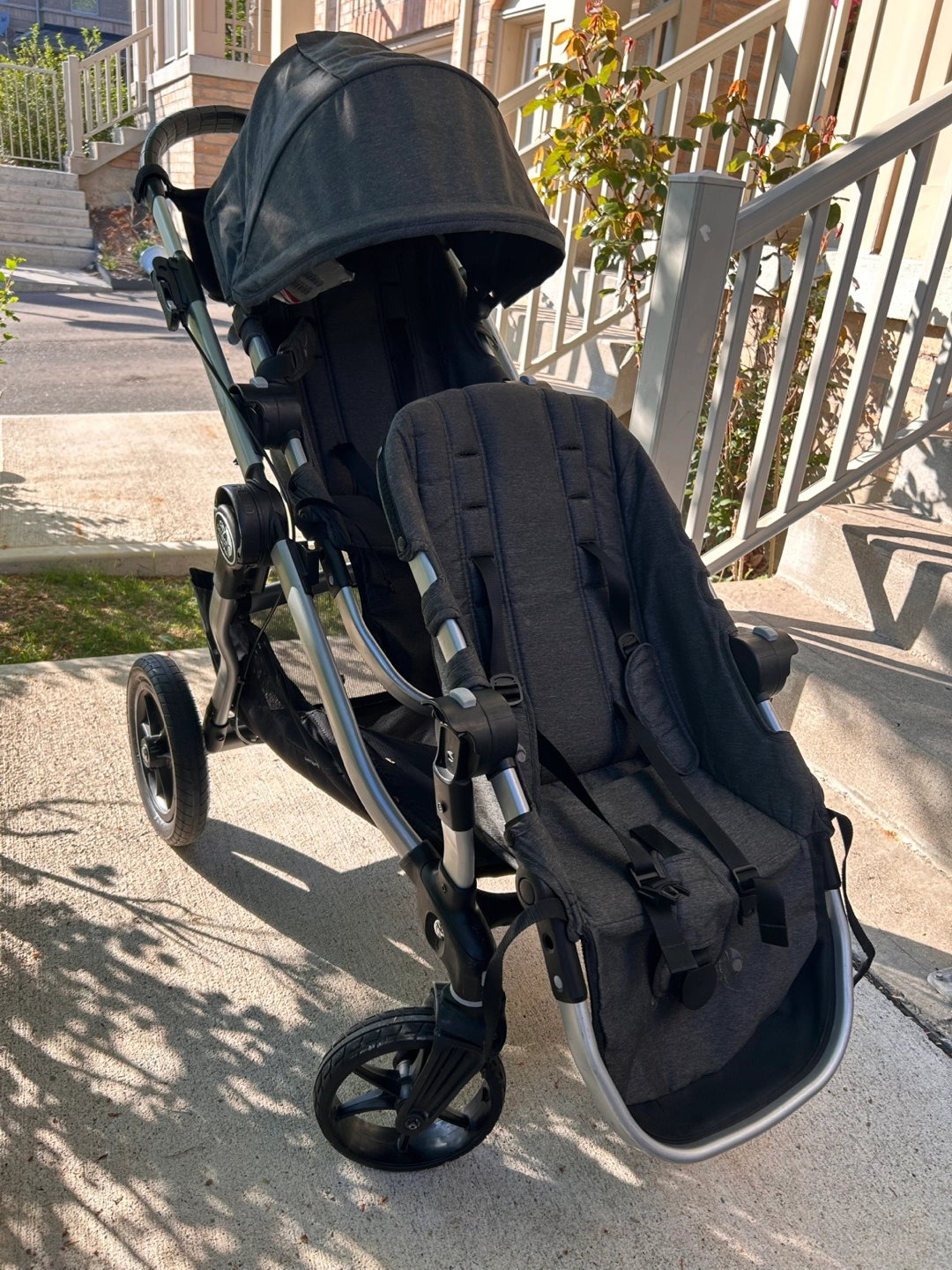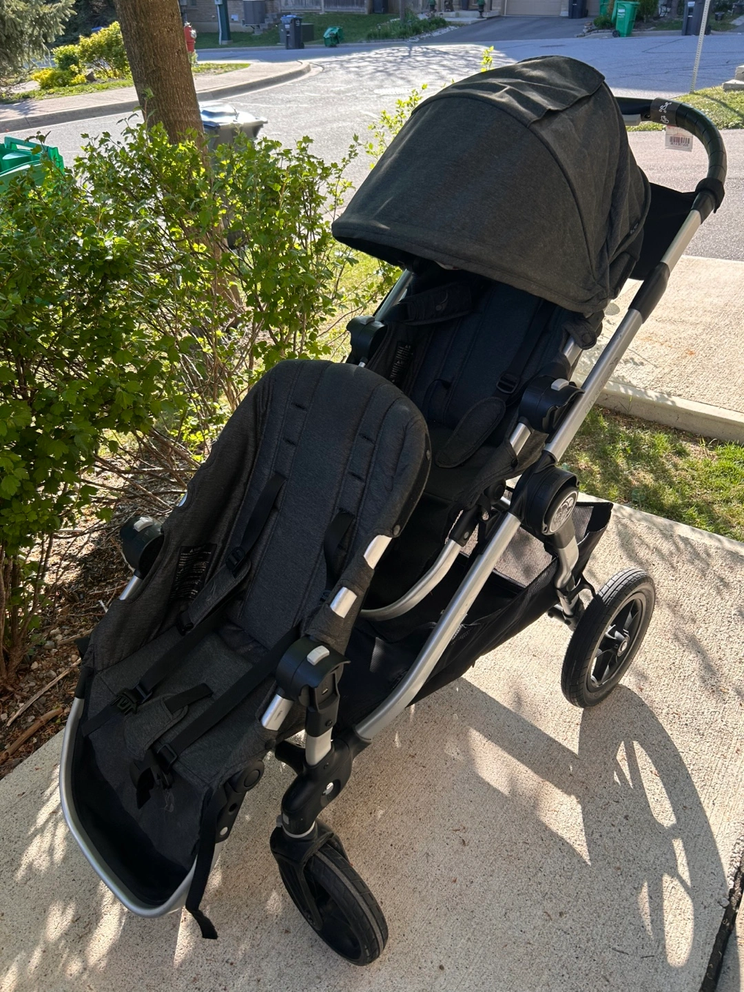 Double stroller, charcoal grey fabric. Suitable for two children. Includes canopy and storage basket. Features swivel wheels. Good used condition.
