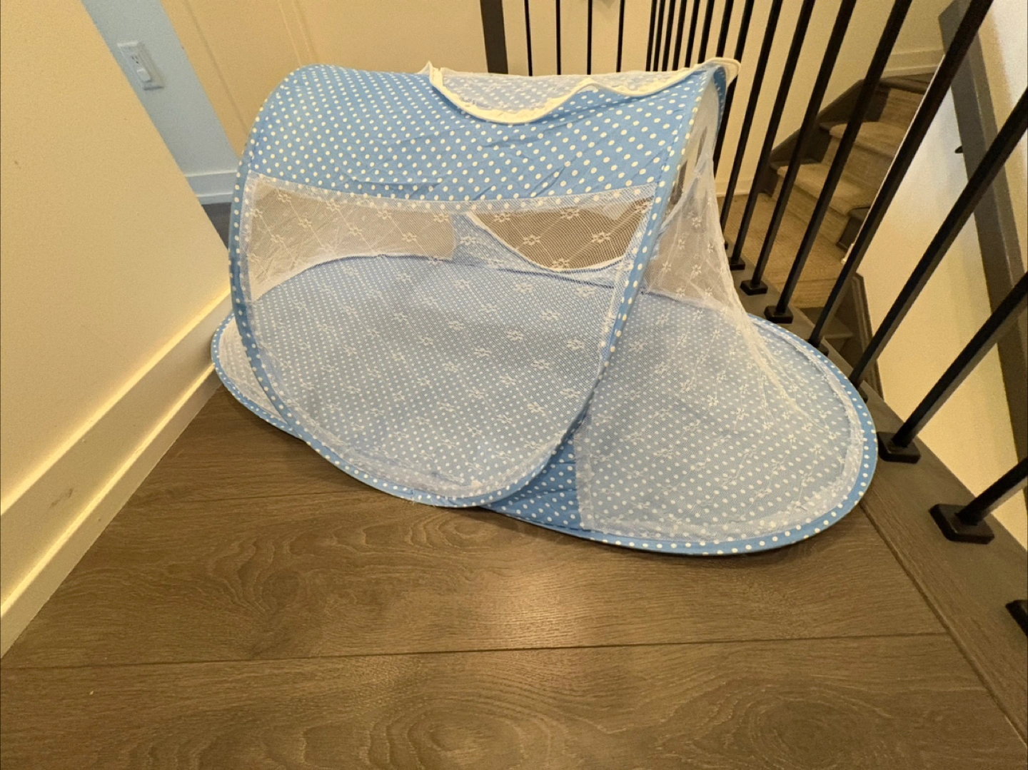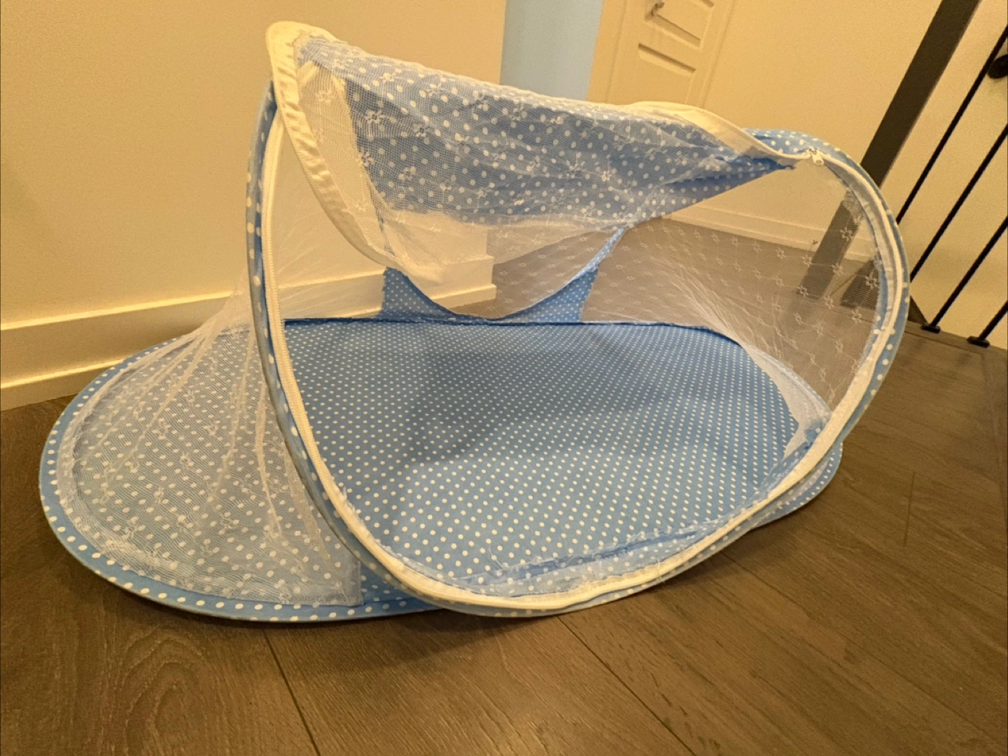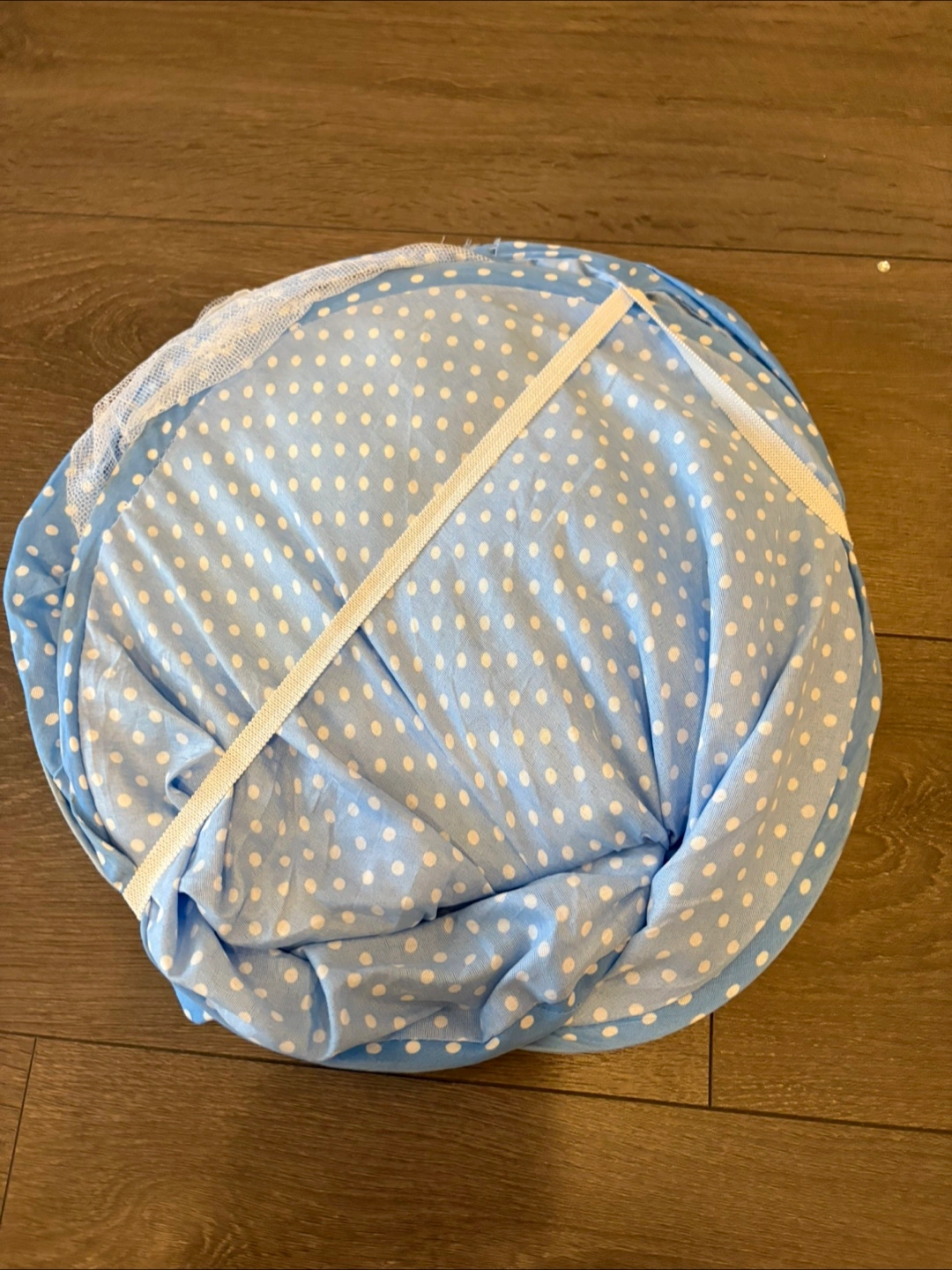 Keep your little one safe from mosquitos with this cute blue polka dot baby mosquito net tent! It's in great condition and perfect for indoor or outdoor use. Lightweight and portable, it's easy to set up and take down for travel or storage