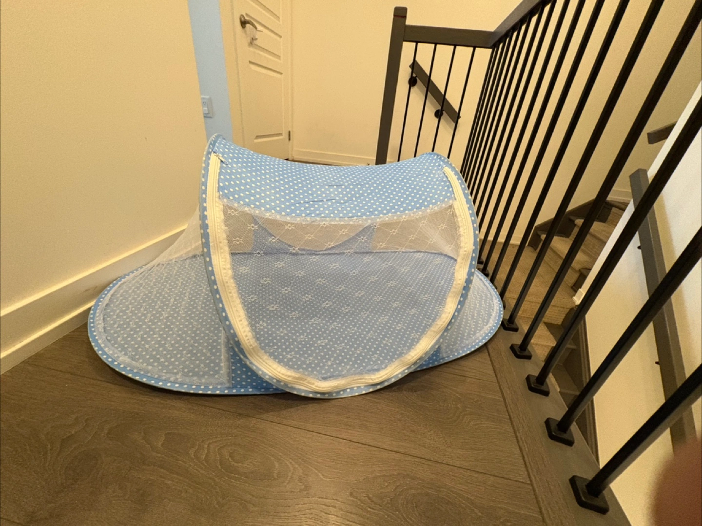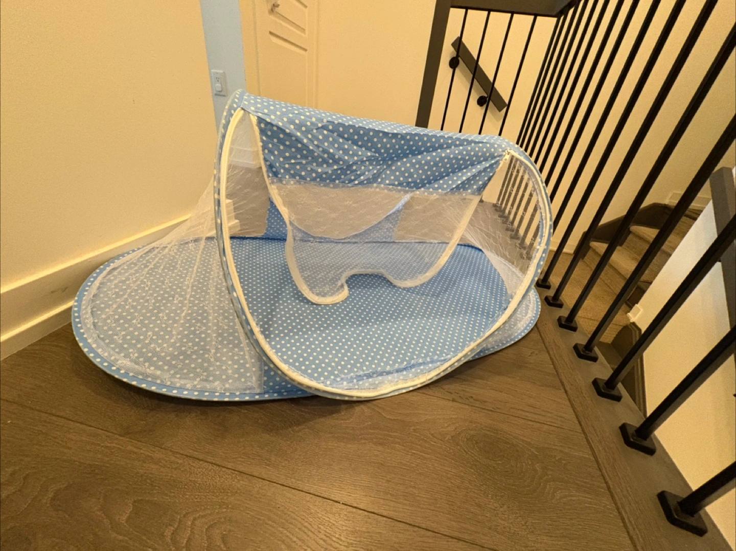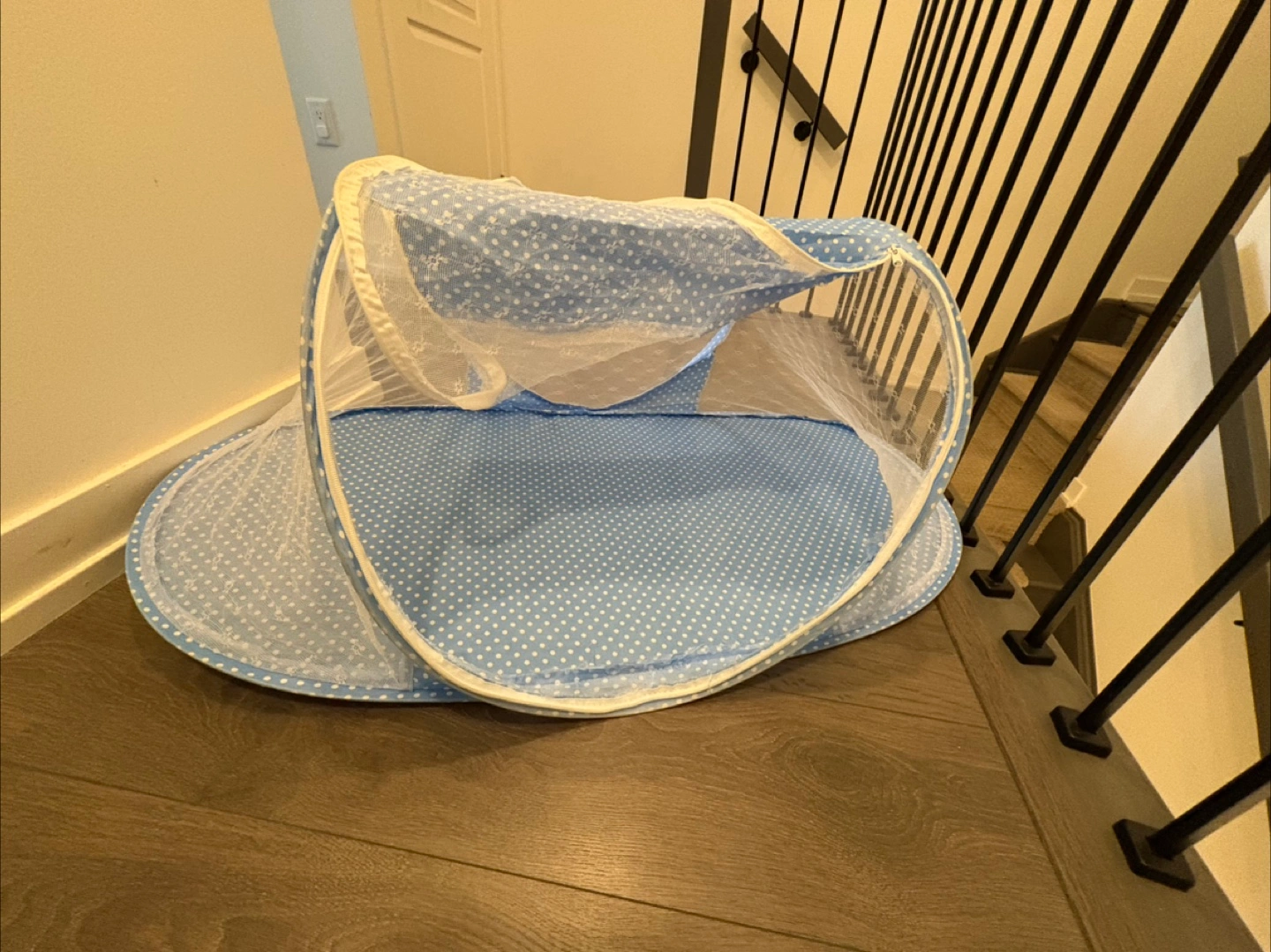 Keep your little one safe from mosquitos with this cute blue polka dot baby mosquito net tent! It's in great condition and perfect for indoor or outdoor use. Lightweight and portable, it's easy to set up and take down for travel or storage