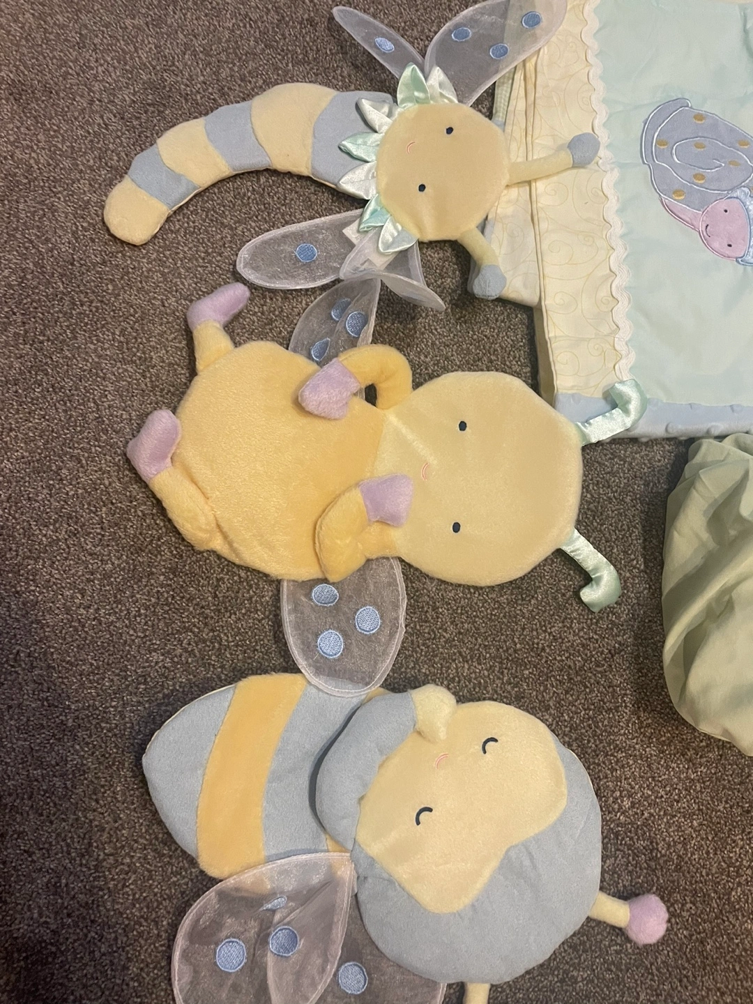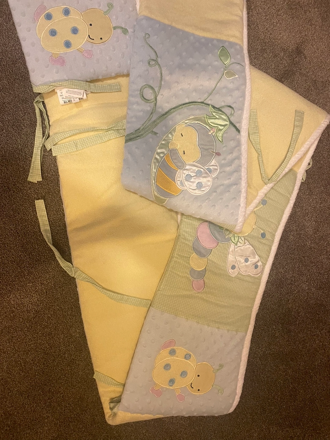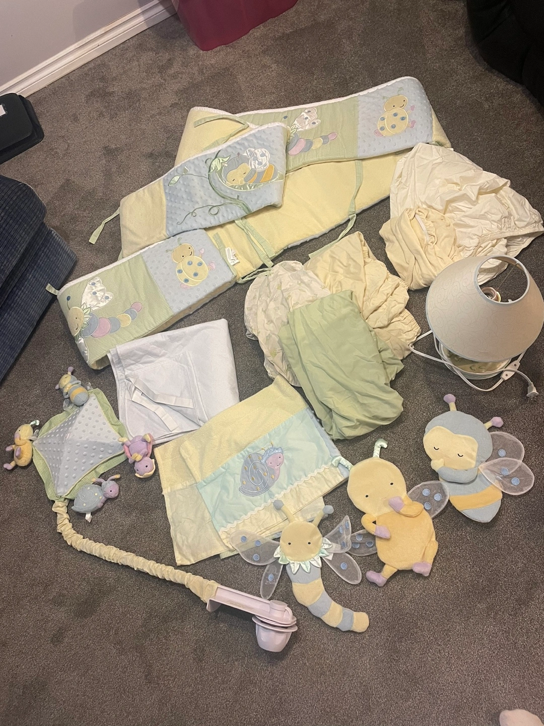 Complete Snug as a Bug nursery set. Includes crib bedding, mobile (without music), and lamp. Also includes extra sheets, change table sheets and wall decor. Adorable bug theme. Pastel greens and yellows. Excellent condition.