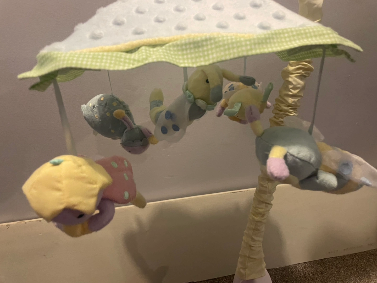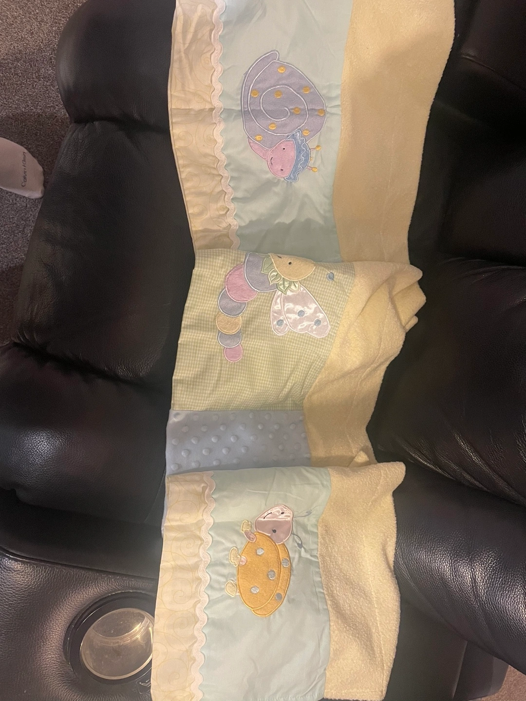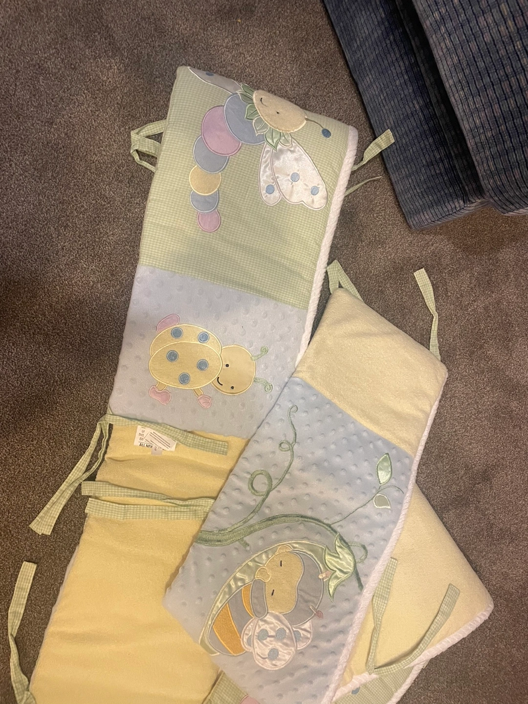 Complete Snug as a Bug nursery set. Includes crib bedding, mobile (without music), and lamp. Also includes extra sheets, change table sheets and wall decor. Adorable bug theme. Pastel greens and yellows. Excellent condition.
