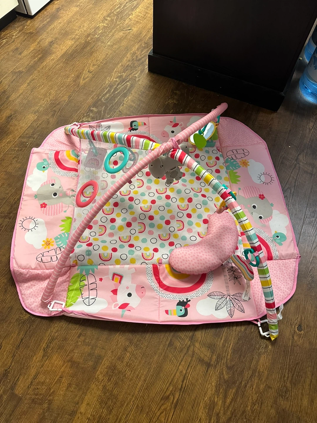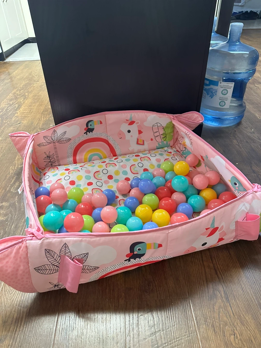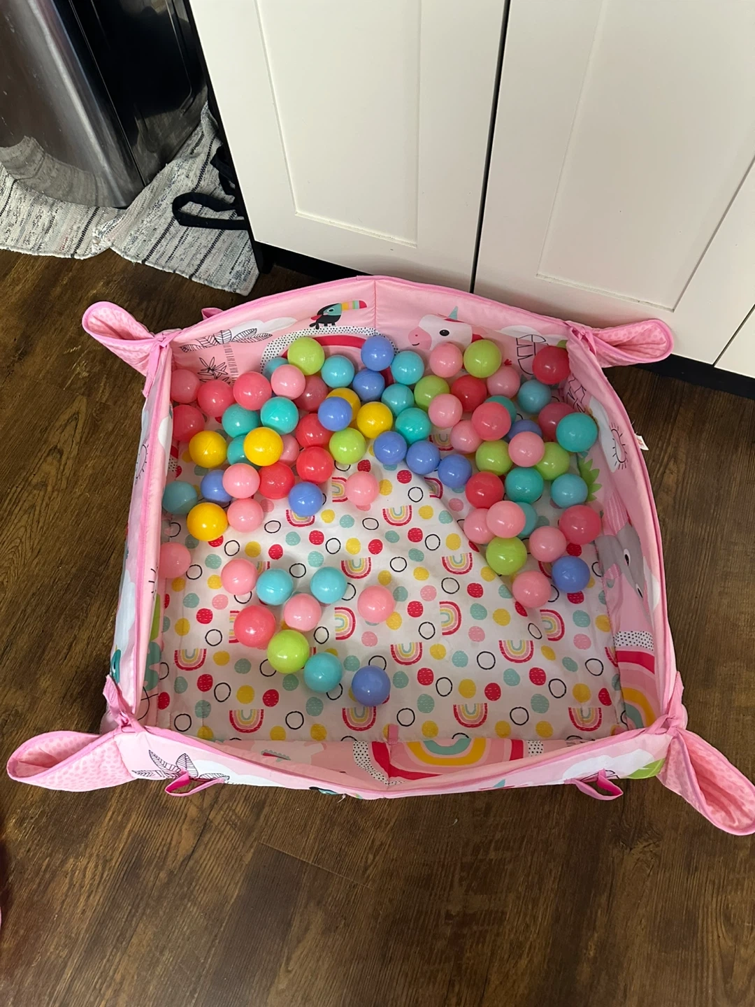 Selling a gently used baby play mat and ball pit set! It's perfect for tummy time and playtime as your little one grows. The mat features cute designs and soft padding for extra comfort. The ball pit is a fun addition, providing hours of entertainment with colourful balls. Some of the hanging toys have been replaced.