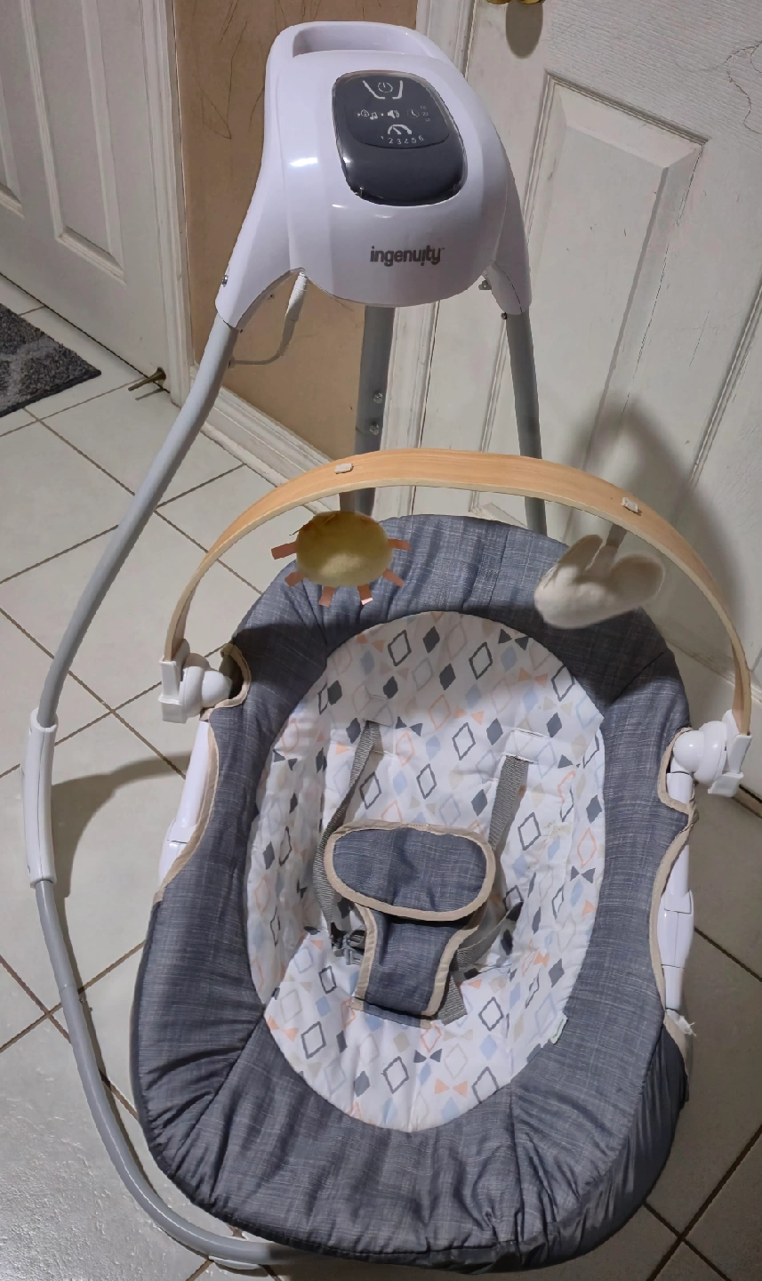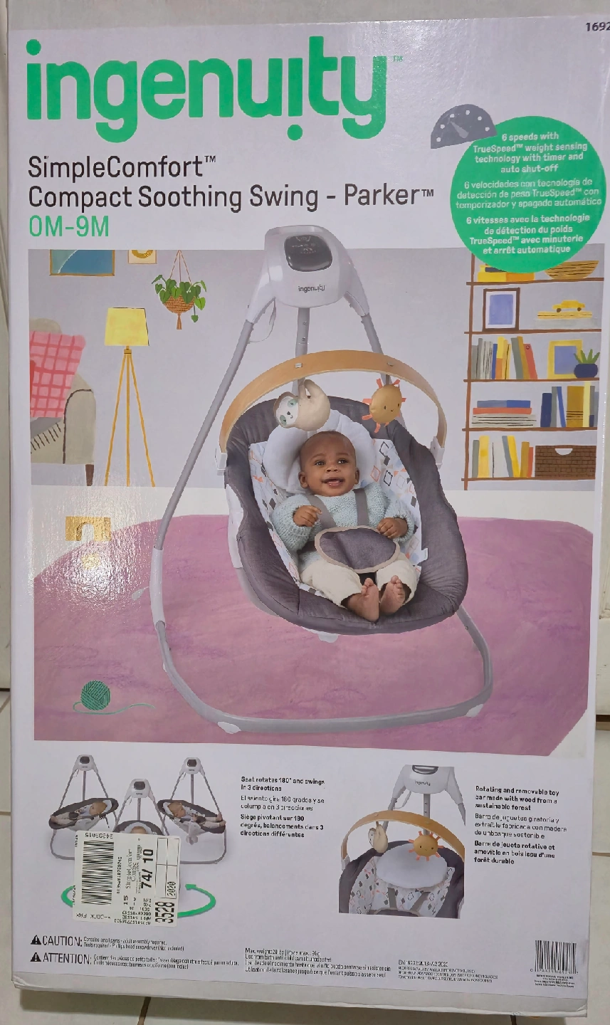 This Ingenuity SimpleComfort Compact Soothing Swing in Parker is perfect for your little one! The seat rotates 180 degrees and swings. It features TrueSpeed sensing technology with timer and soothing sounds. The swing is compact and easy to store. It has a rotating and removable toy bar made with wood for a durable and comfortable design.