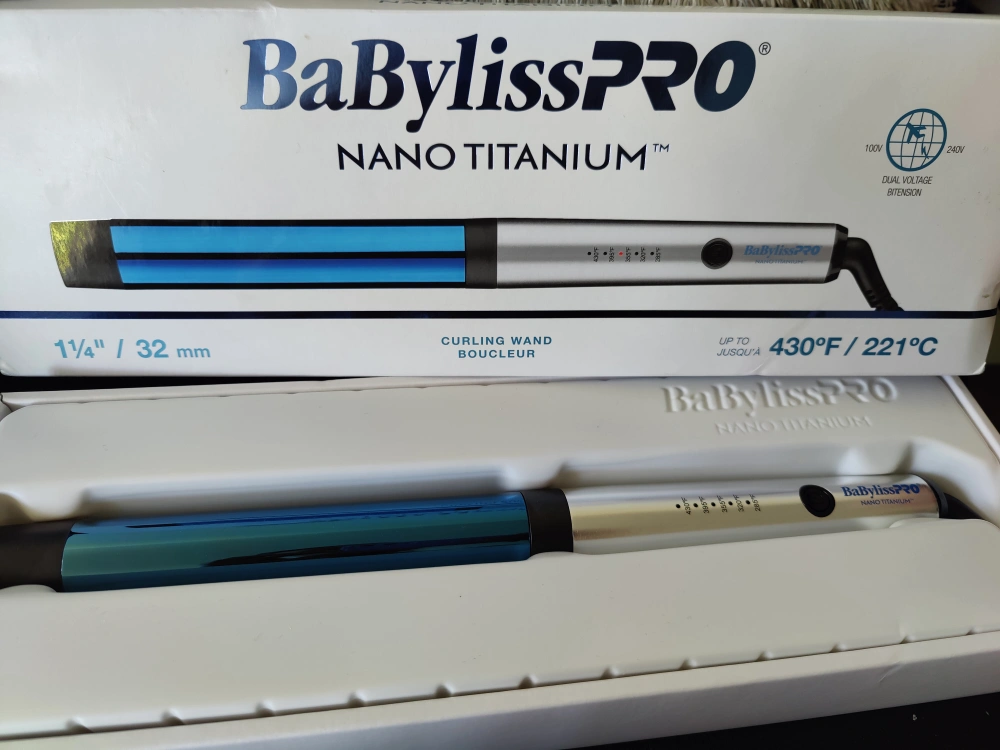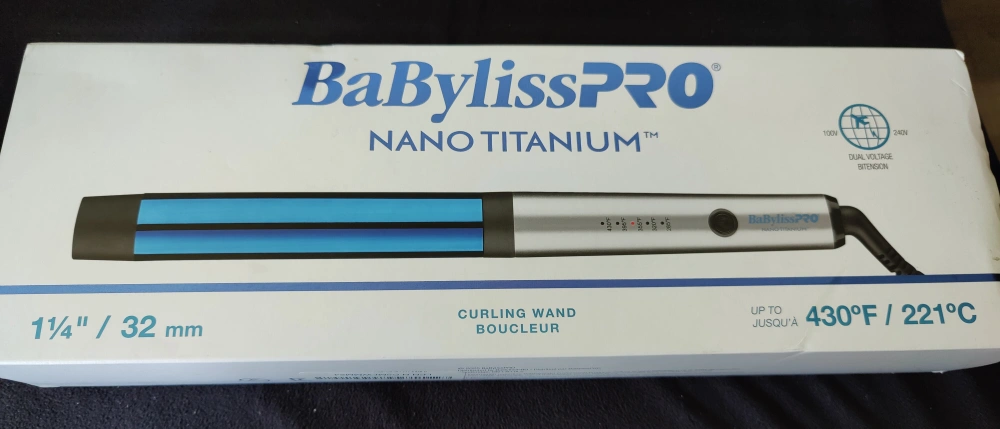 Selling a BaBylissPRO Nano Titanium curling wand. It's 1 1/4" / 32 mm and heats up to 430°F / 221°C. It has dual voltage for international use. Comes with the original box