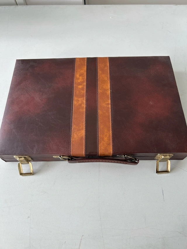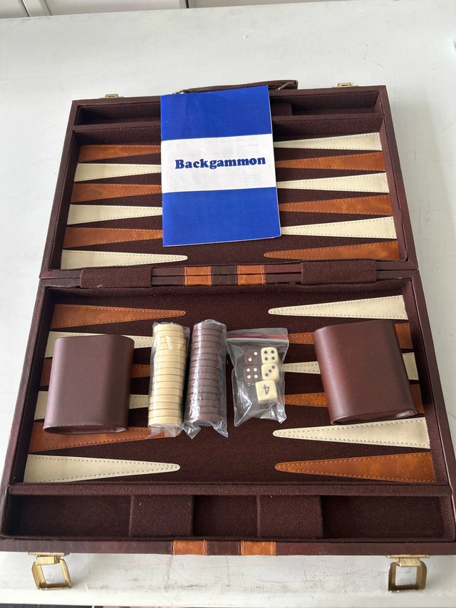 I'm selling a complete and portable Backgammon set, perfect for game nights or travel. The set is in good condition and includes all the necessary pieces to get started with this classic game. It features a handsome, leather-like carrying case. This backgammon set is ready to provide hours of strategic fun!