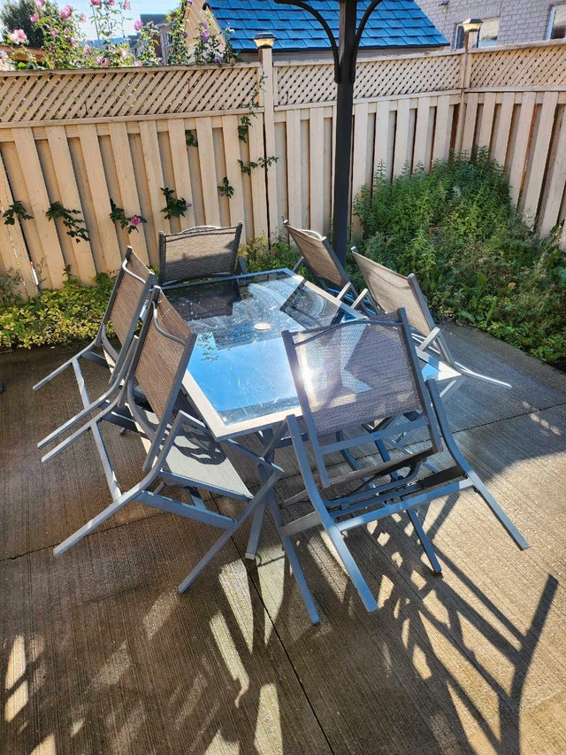 This glass table comes complete with 6 rocking seats, perfect for enjoying outdoor meals or relaxing in the sun. This set has been used and has some wear, but it remains in good condition and ready for a new home. * Seats: 6 rocking seats * Tabletop: Glass Looking to sell for $200. This set is ready to enhance your outdoor experience. If the ad's up, it's up for grabs!