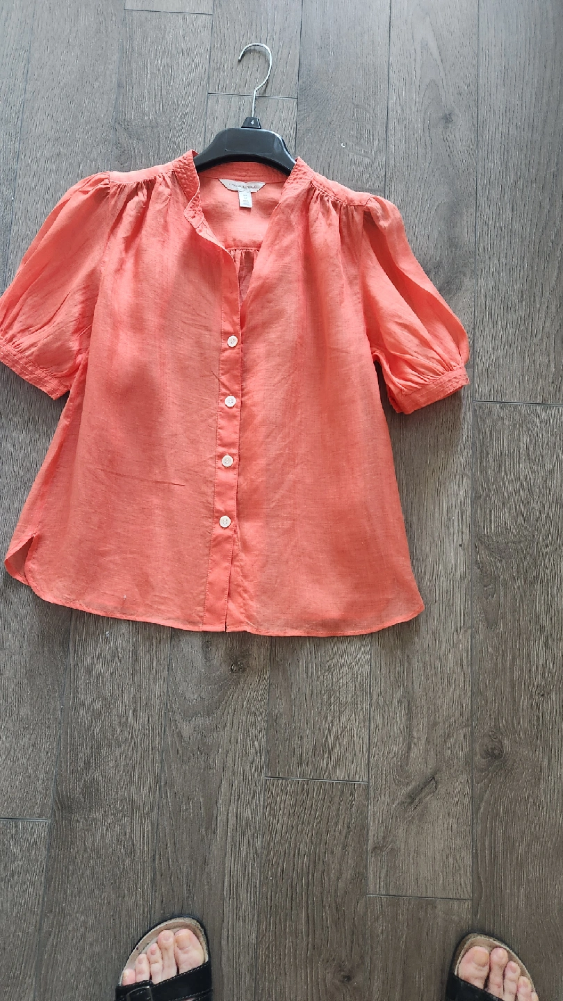 Here's a lovely Banana Republic shirt in a petite size small. It's a pretty coral colour and made of 100% Ramie